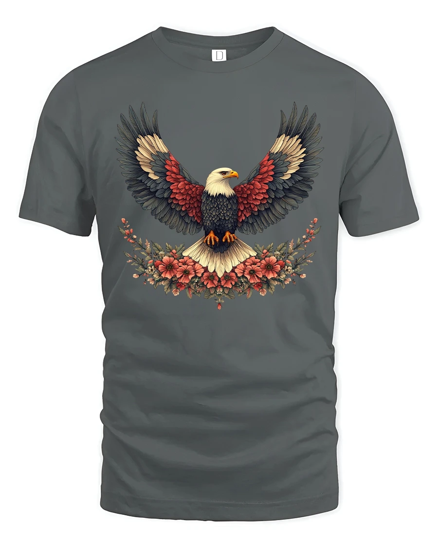 Majestic Bald Eagle Wings Floral Art Freedom Graphic Tshirt showcases a powerful symbol of strength and independence blended with elegant natural beauty.