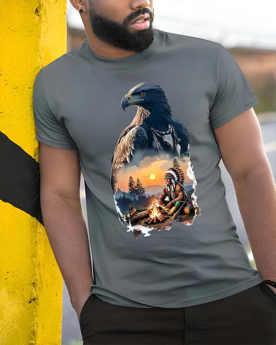 Majestic Eagle Spirit Native Campfire Scenic Graphic T Shirt - model wearing grey tee, leaning on column