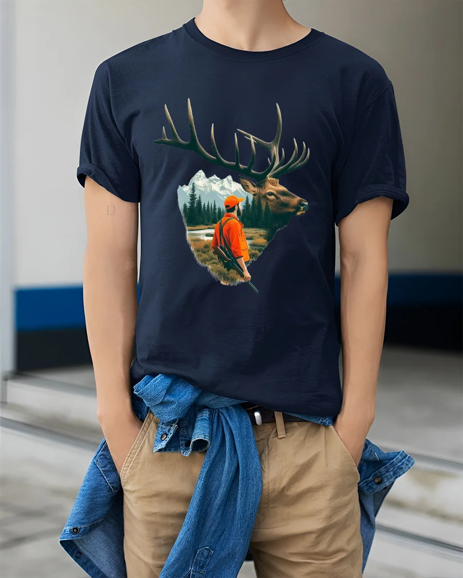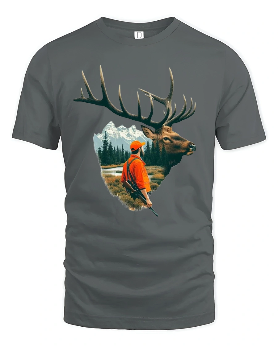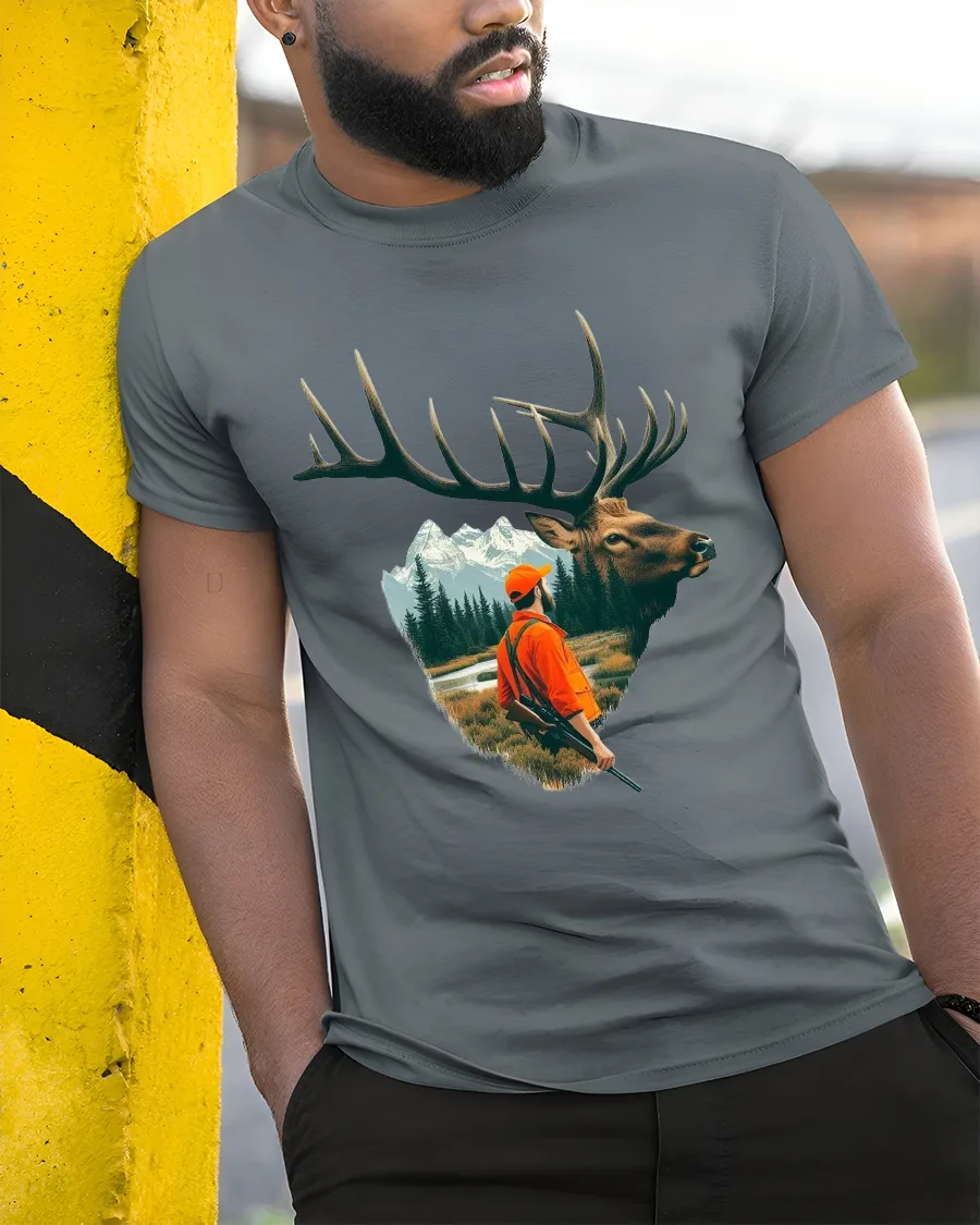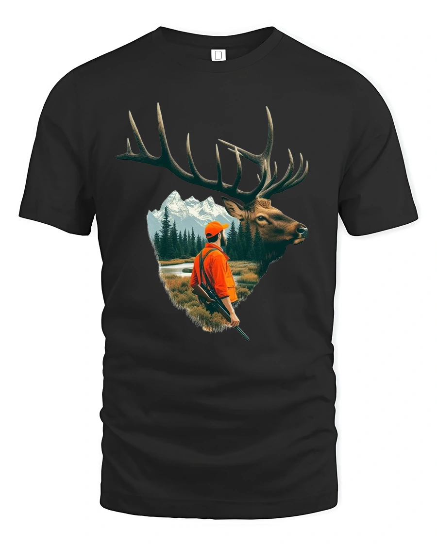 This majestic elk and hunter wilderness adventure illustration graphic tshirt features a striking elk profile blended with a scenic mountain forest landscape and a focused hunter figure.