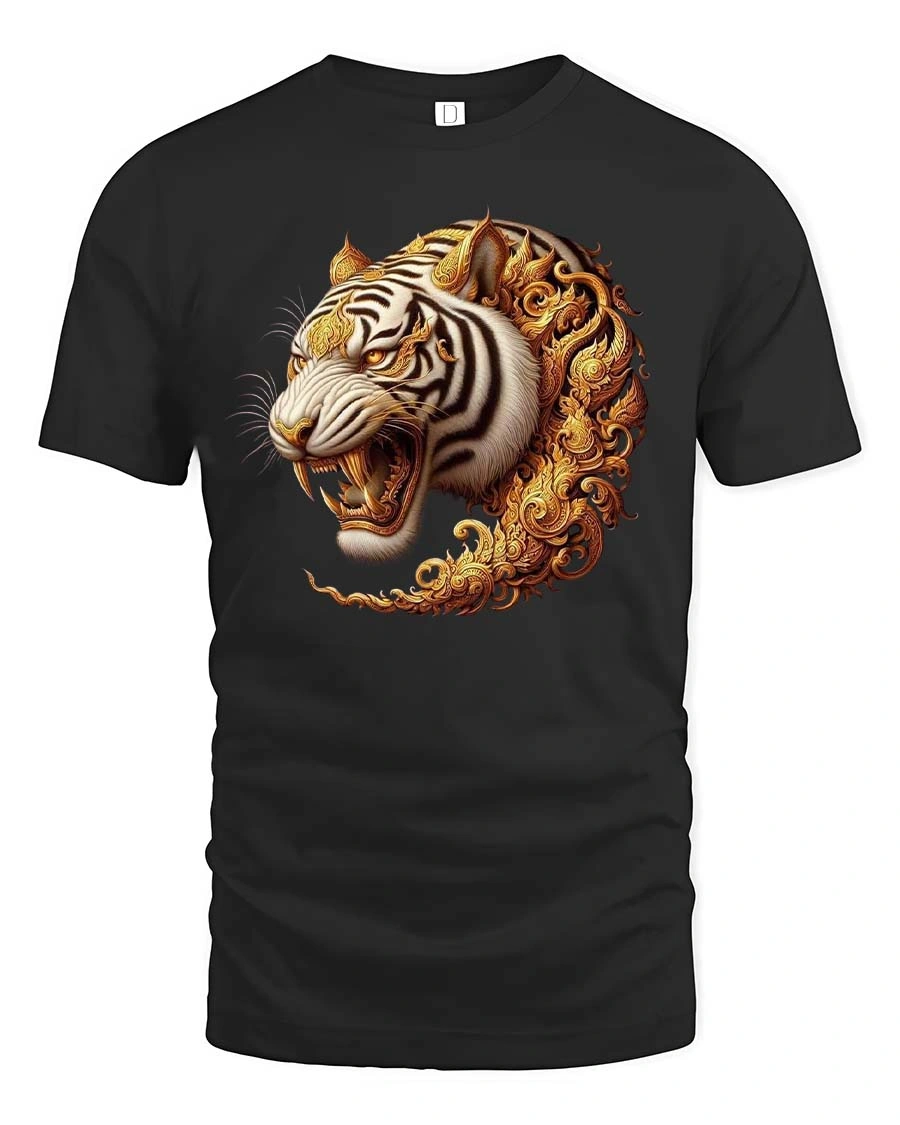 The roaring tiger symbol represents confidence, courage, and untamed spirit, while the golden ornamental elements add a touch of artistic elegance that makes the design both powerful and visually memorable.