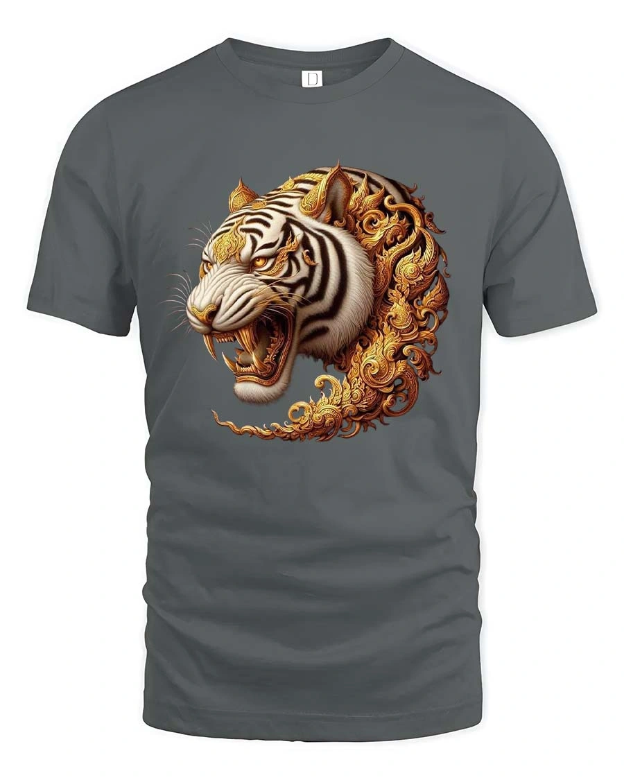 Majestic Golden Tiger Head Ornamental Art Graphic T Shirt - gray t-shirt on white background