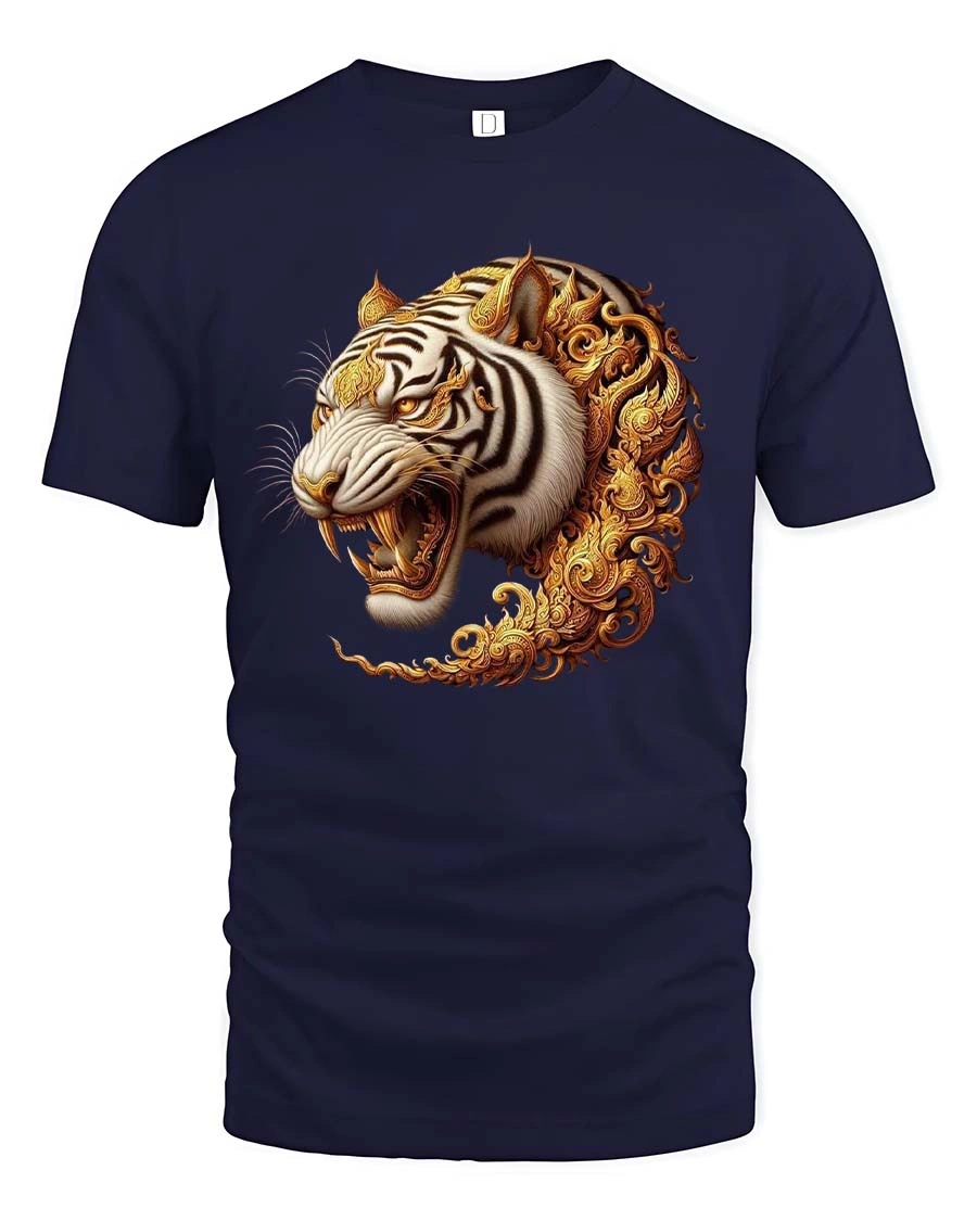 Majestic Golden Tiger Head Ornamental Art Graphic T Shirt features a powerful tiger portrait combined with elegant ornamental design elements.