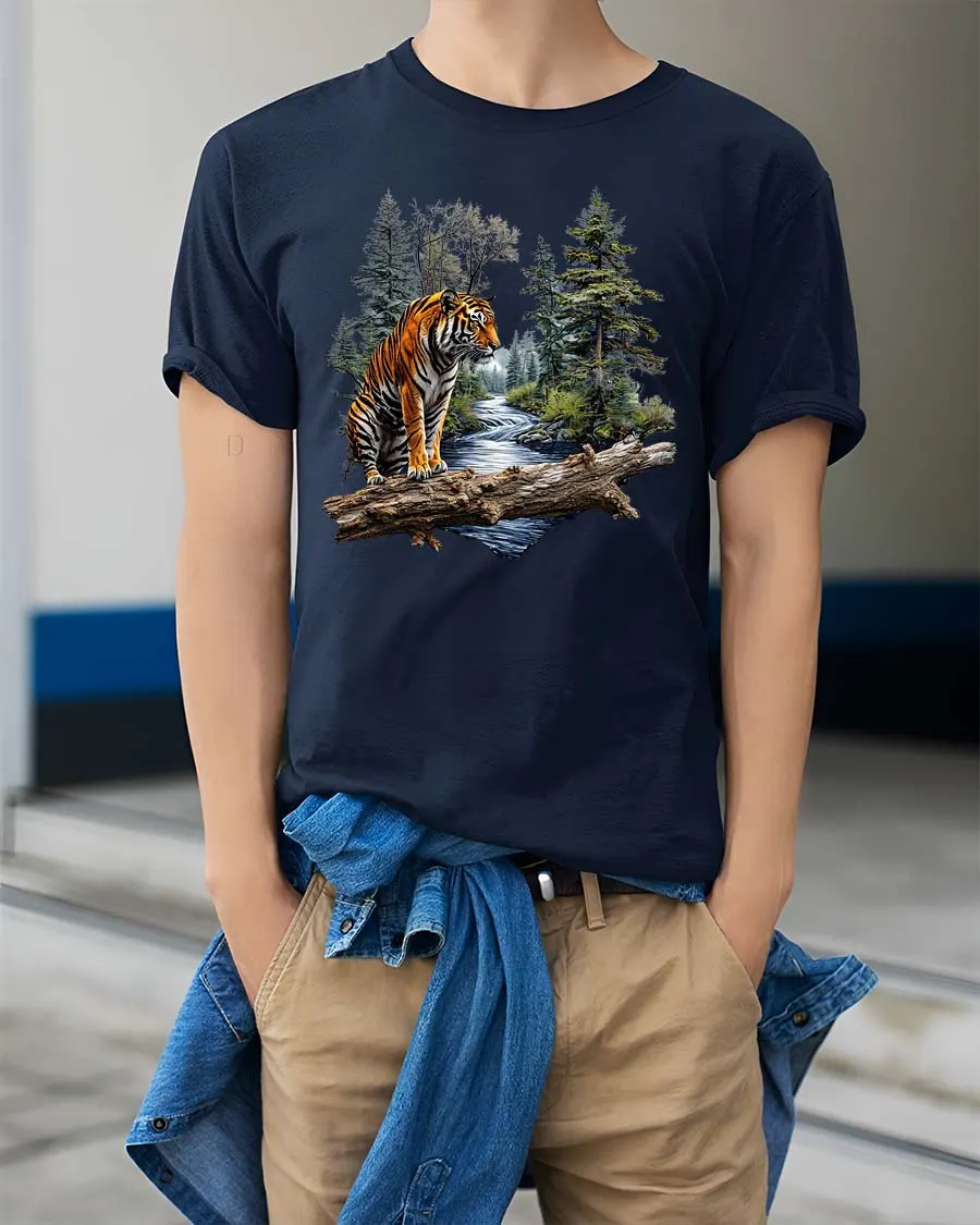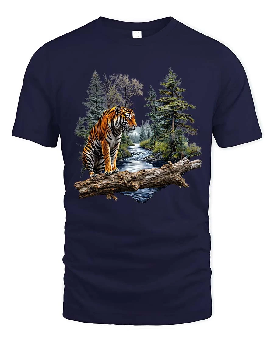Majestic Tiger Forest River Graphic T Shirt Wildlife Nature Art captures the calm strength and beauty of the wild in a detailed scenic design.