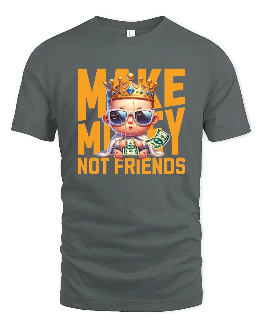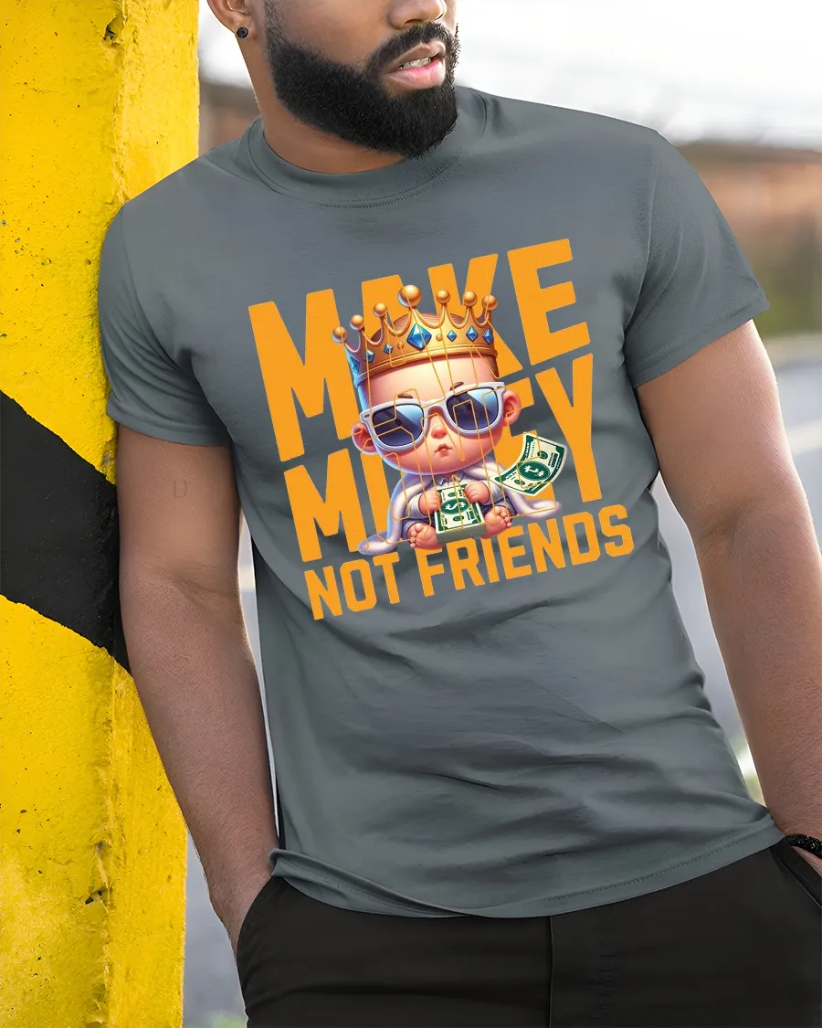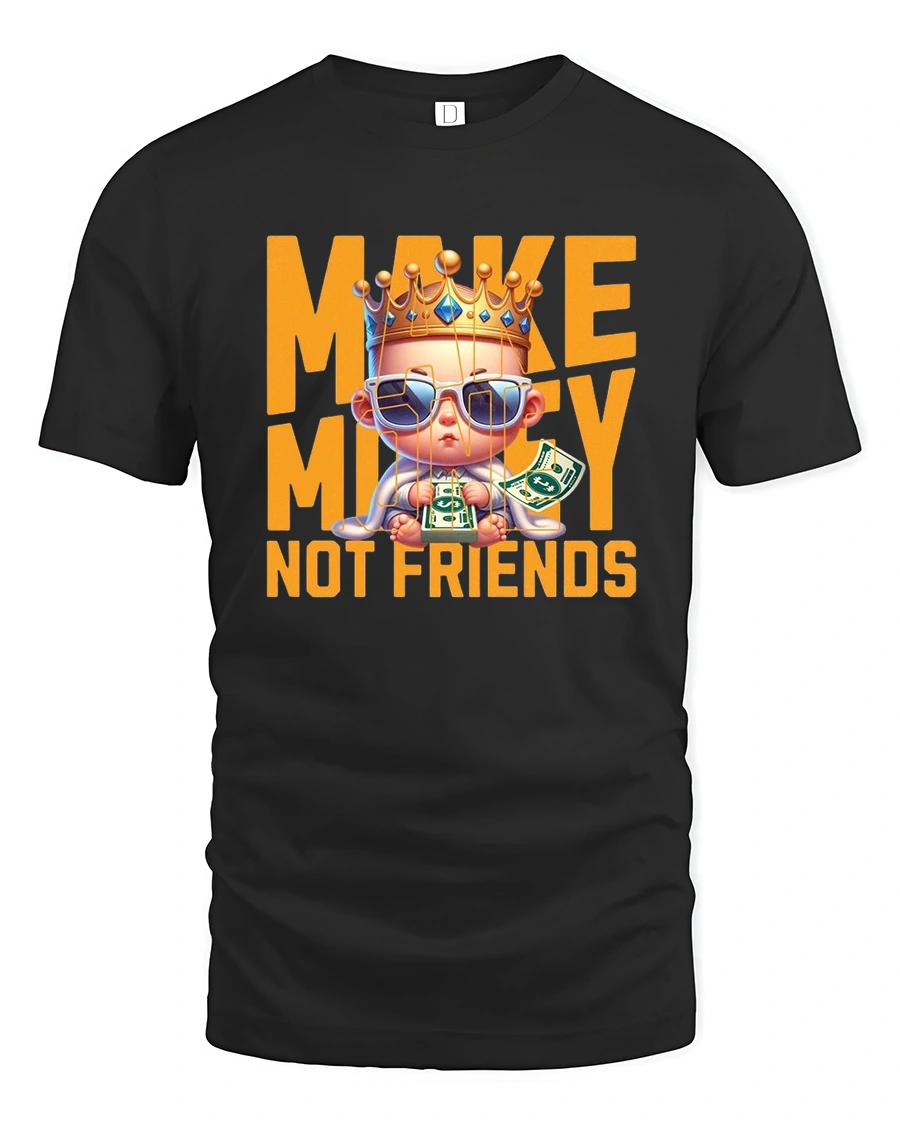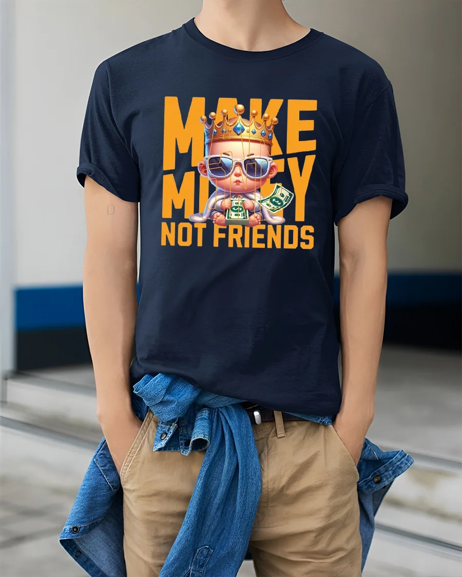 Show off your hustle mentality with the Make Money Not Friends T-Shirt Funny Hustle Style, featuring a bold graphic of a crown-wearing baby holding stacks of cash. This eye-catching design is perfect for anyone who believes success comes first and attitude speaks louder than words.