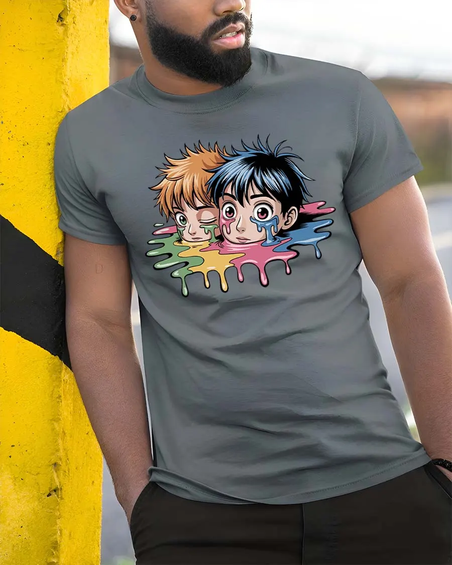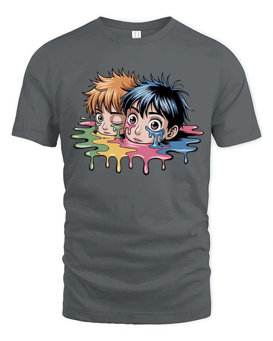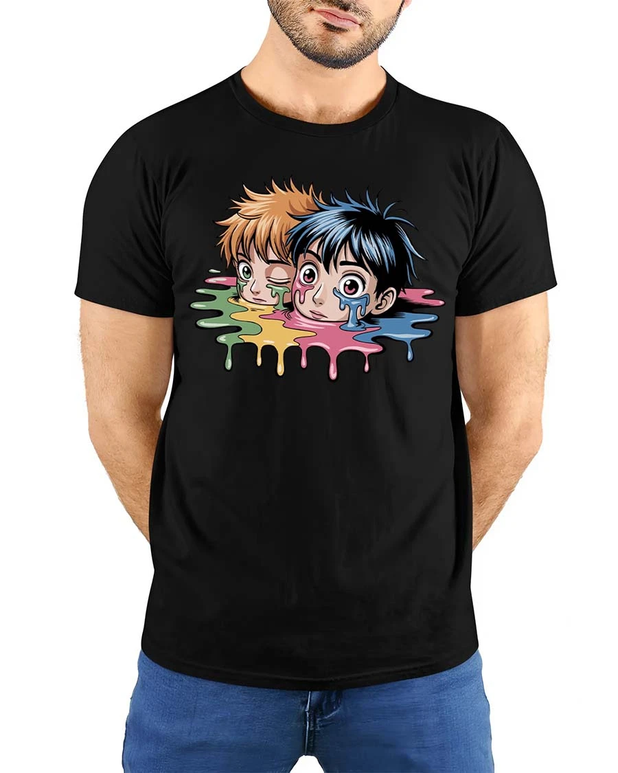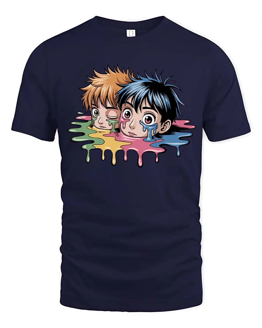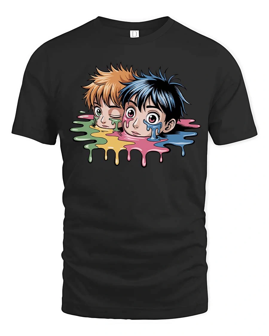 Melting Anime Duo Graphic T Shirt Color Drip Art Tee features a unique and emotional design with two expressive anime faces blending into vibrant dripping colors.