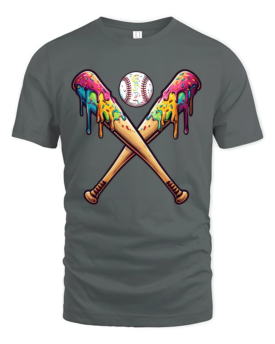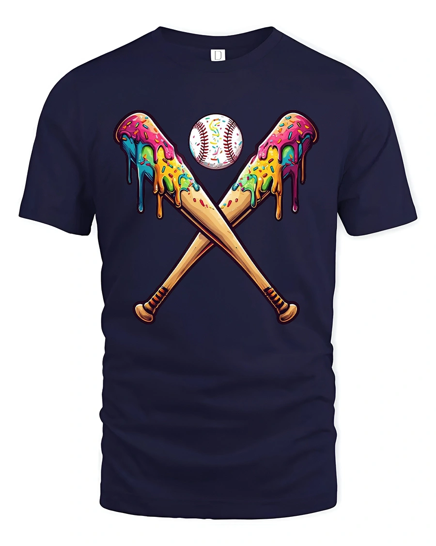 Featuring two crossed bats dripping with bright rainbow colors and a baseball at the center, this design blends energy, creativity, and humor into one eye-catching tee.