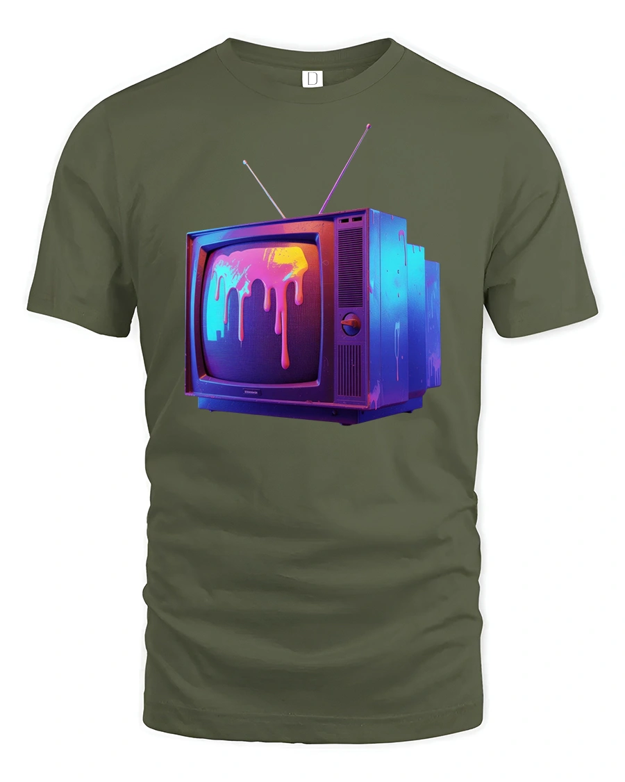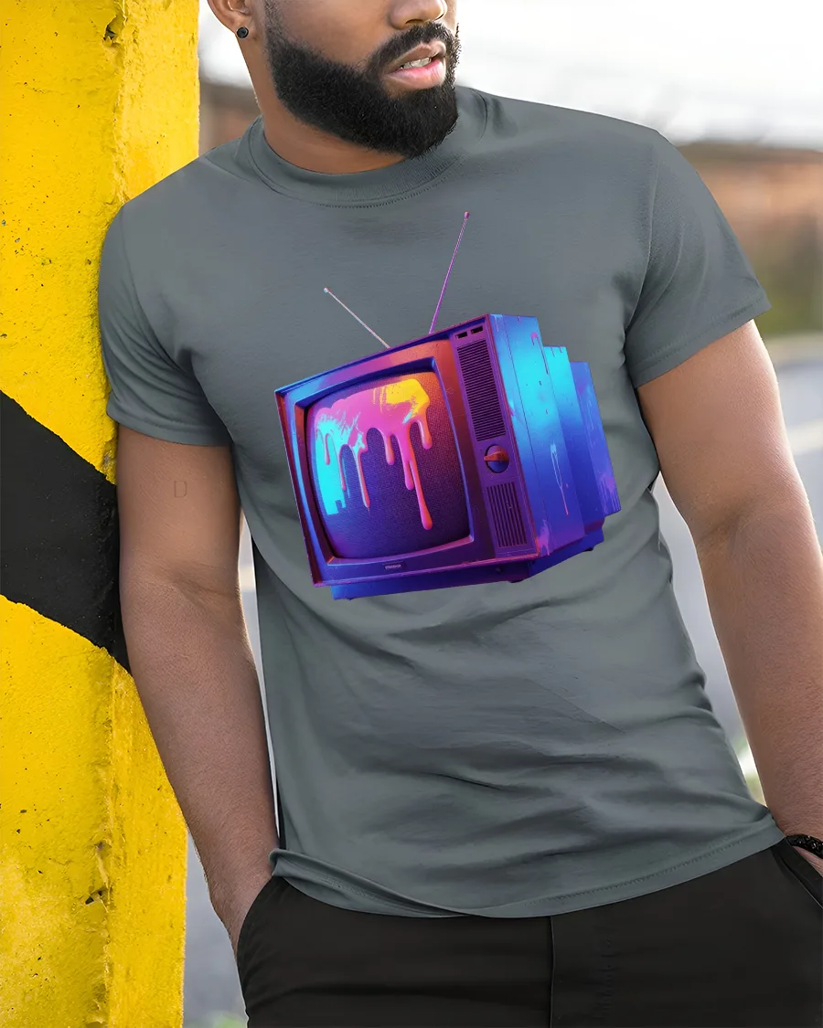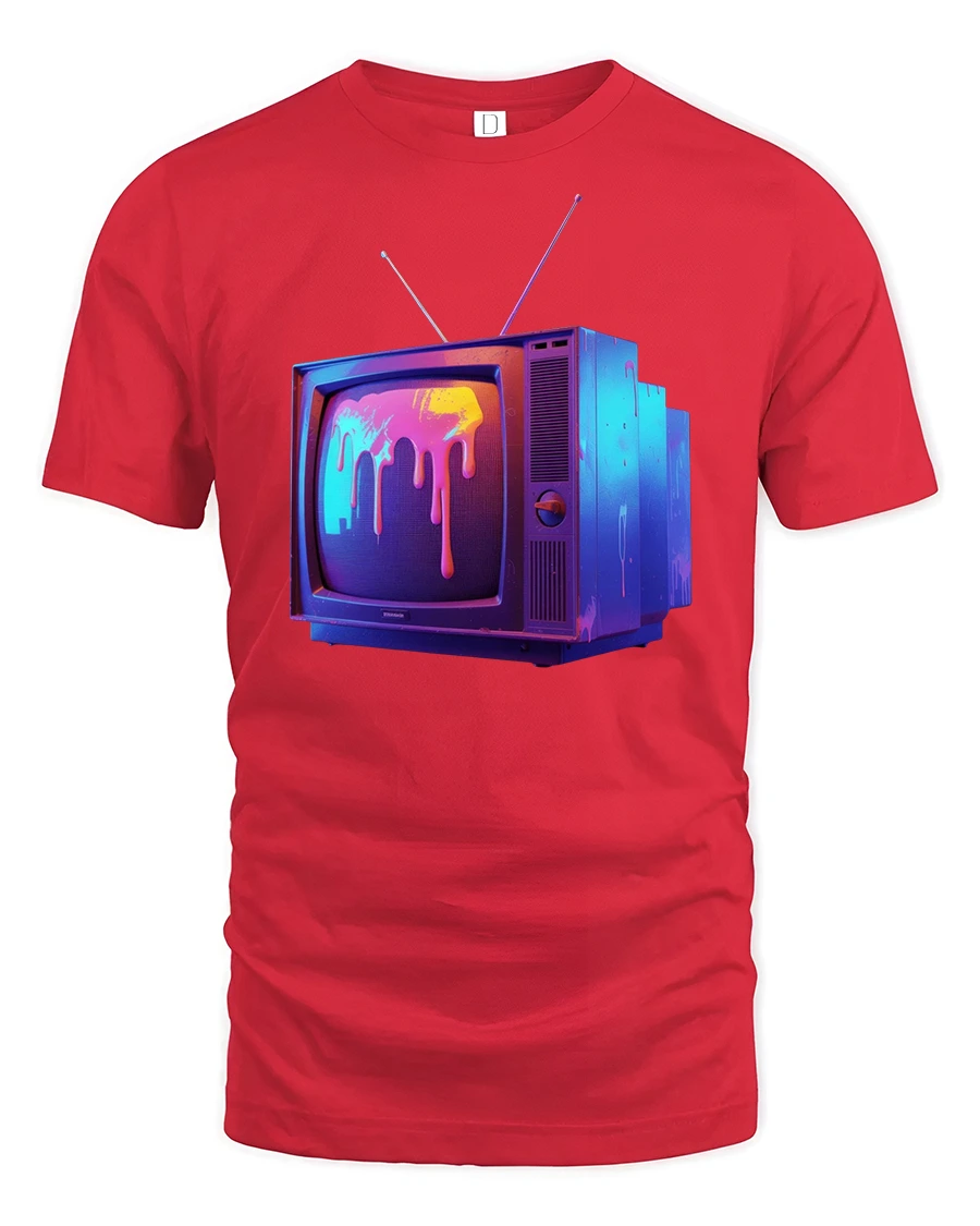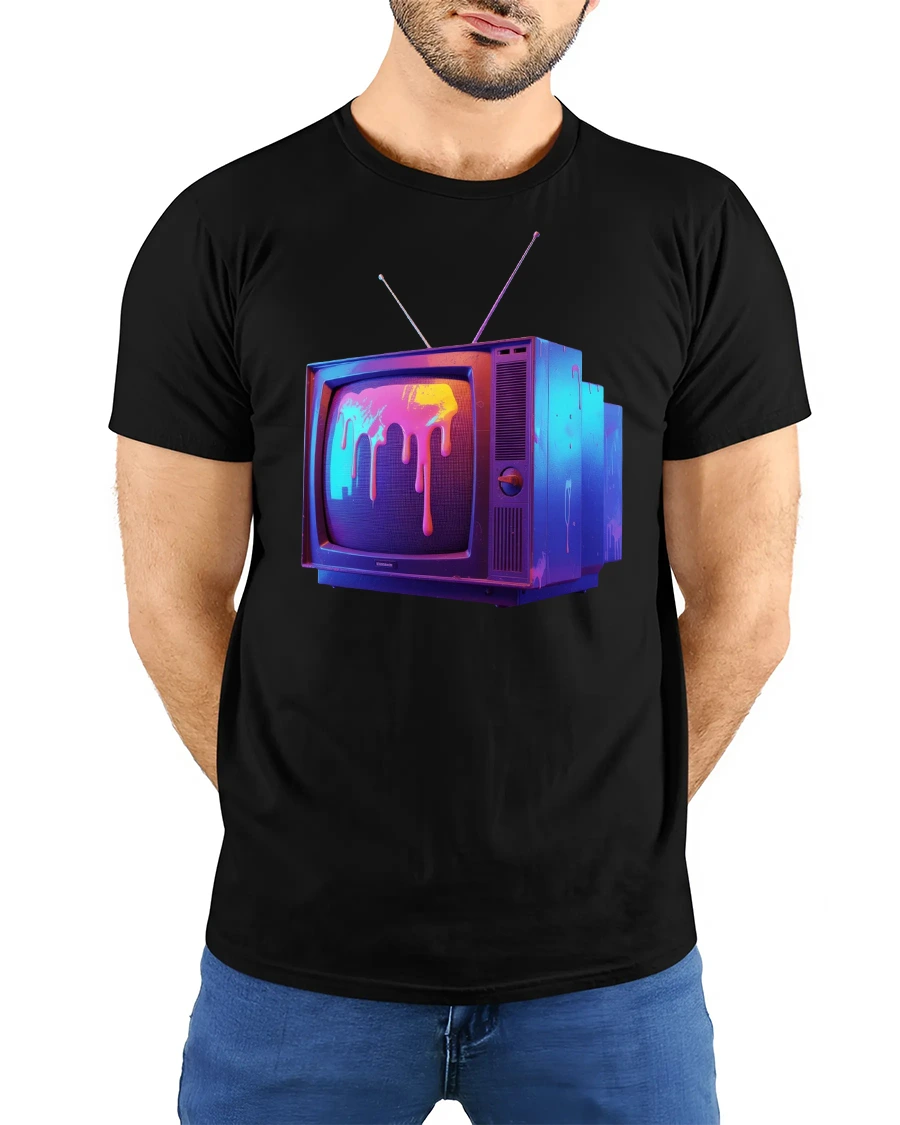 Featuring a dripping neon television graphic, this tee captures the essence of 80s retro culture and modern digital art.
