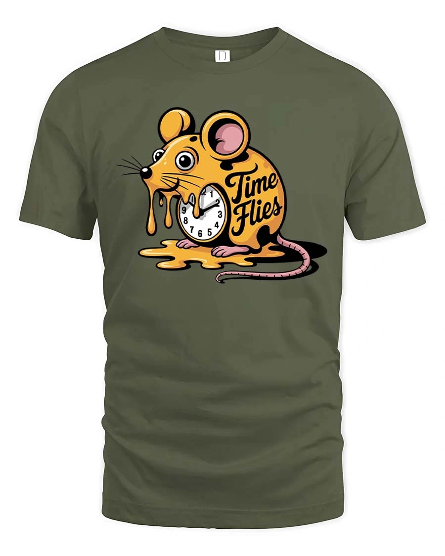 Melting Time Flies Mouse Graphic Funny Cartoon T-Shirt - military green t-shirt on white background