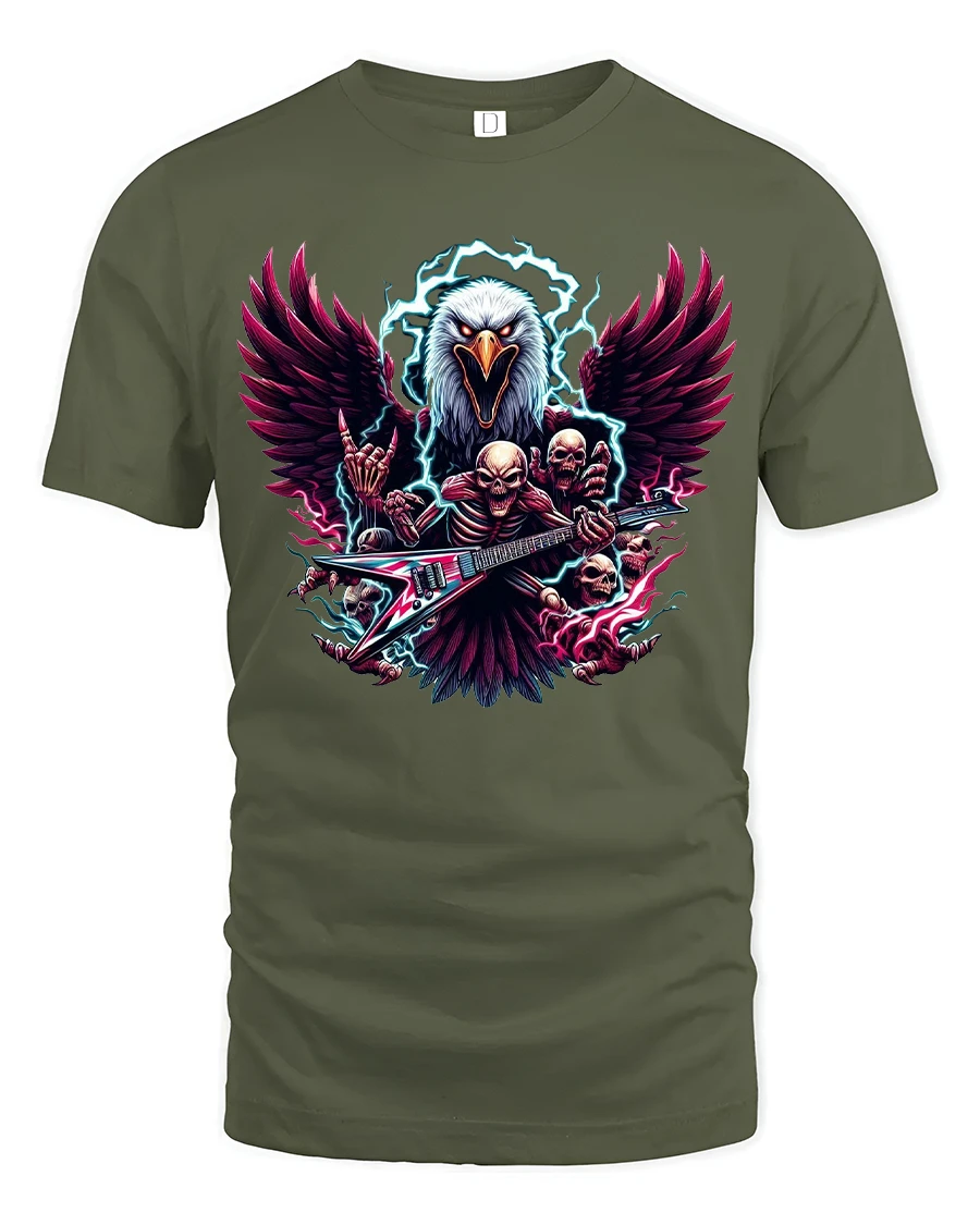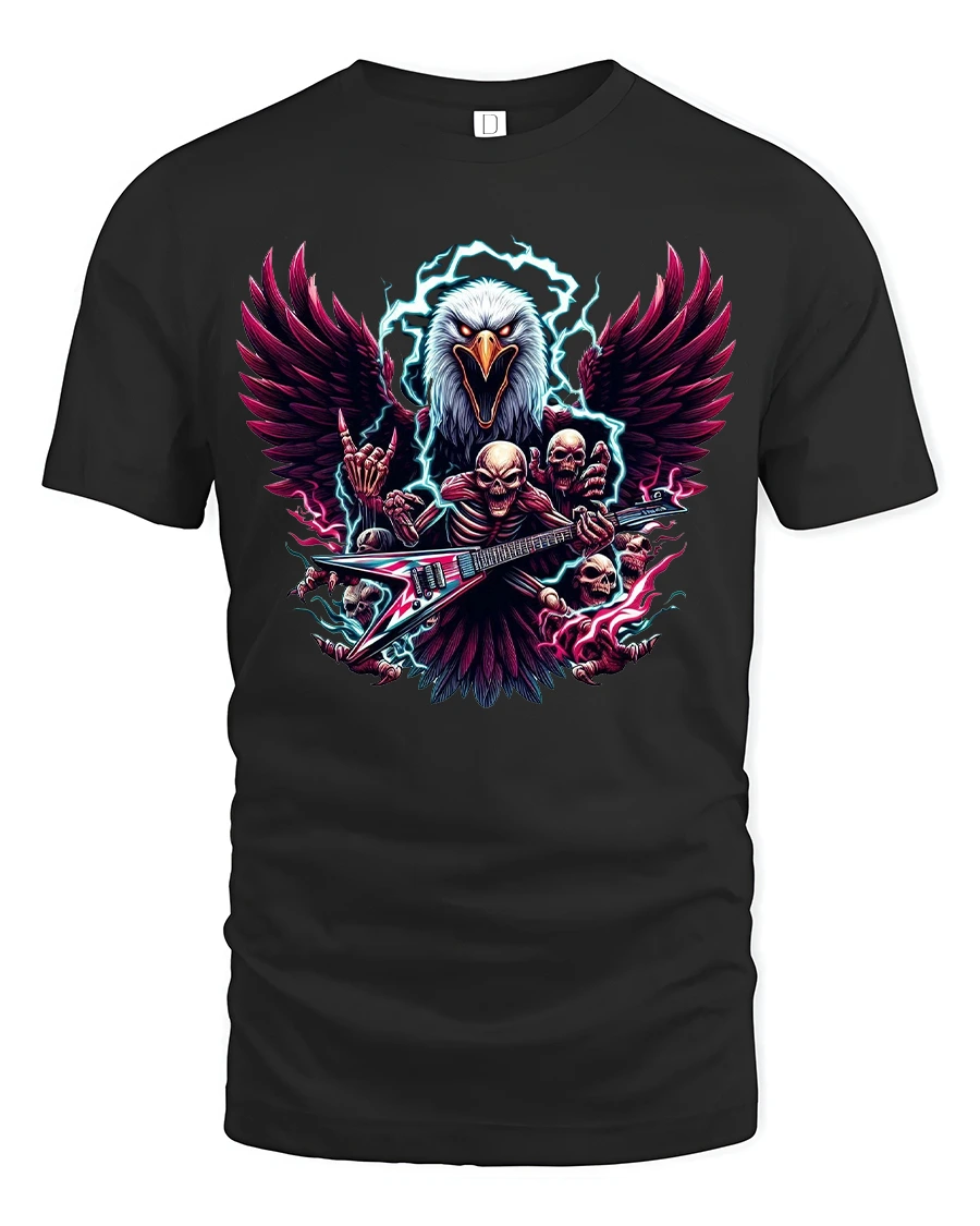 Show off your bold style with the Metal Eagle Guitar Rock Skull Graphic T-Shirt. Featuring a fierce eagle, detailed skulls, and an electric guitar surrounded by lightning, this design is perfect for fans of heavy metal, rock bands, and hardcore biker fashion. Its vibrant artwork stands out, making it a statement piece for concerts, festivals, and casual streetwear.
