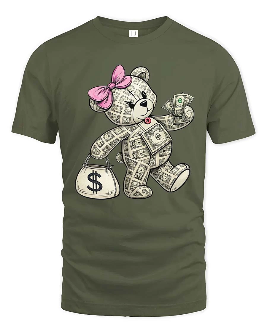 Money Bear T Shirt Cute Cash Lover Funny Rich Vibes Graphic - military green t-shirt on white background