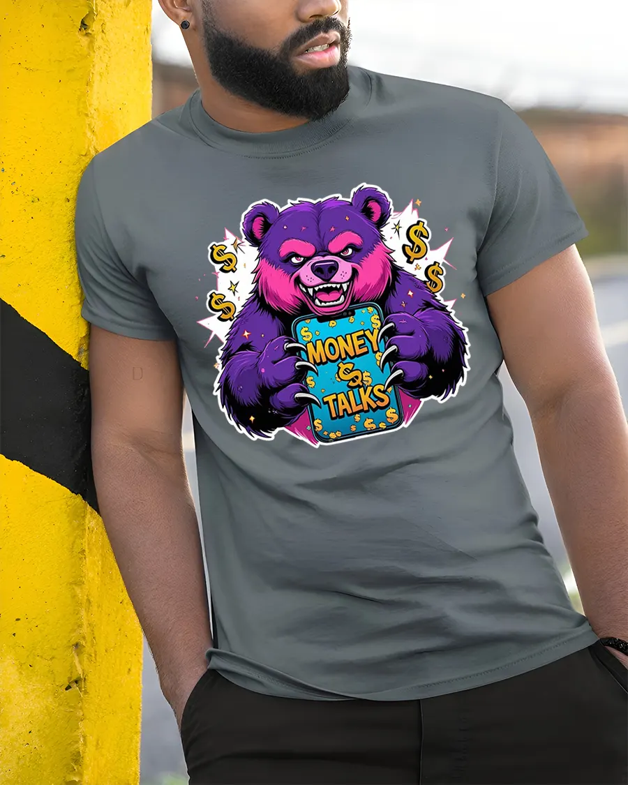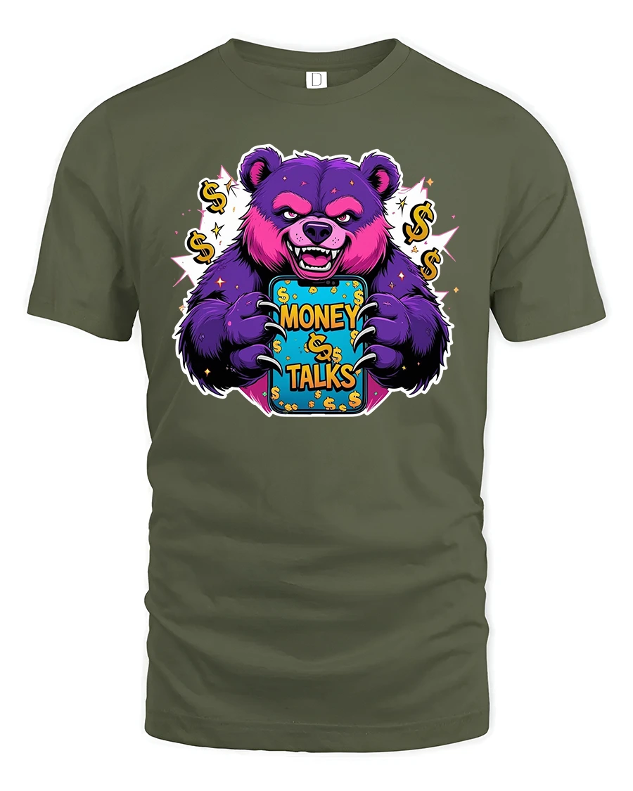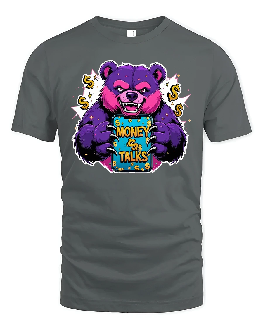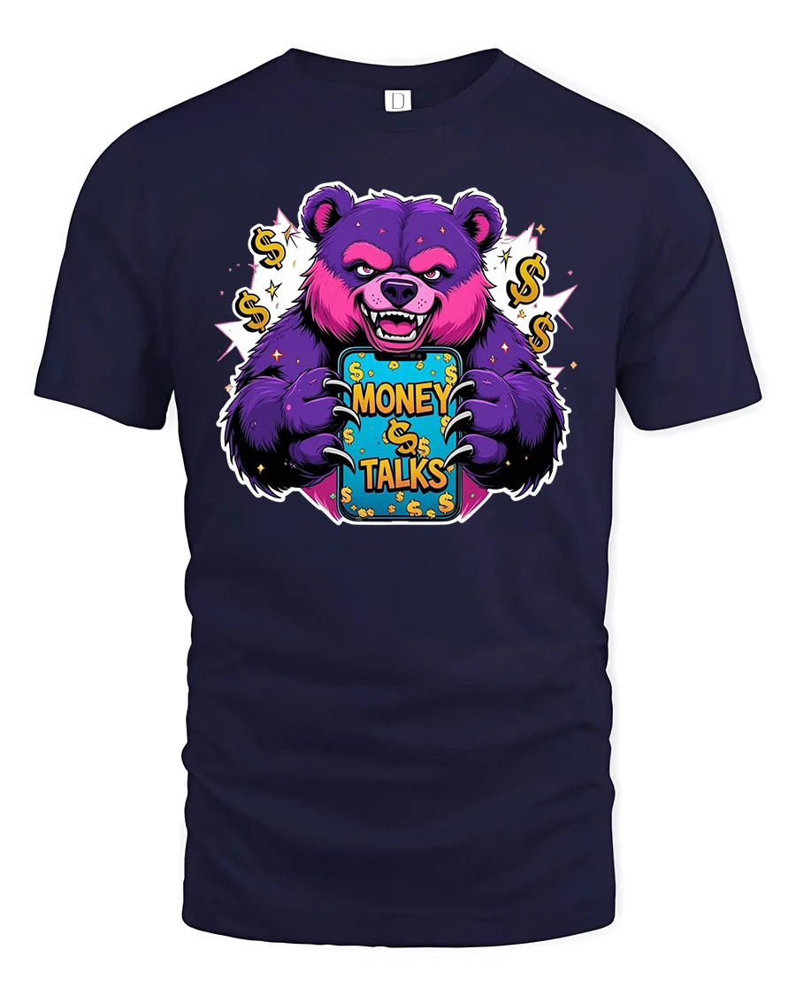 Featuring a fierce purple bear holding a glowing “Money Talks” sign, this design screams boldness and hustle energy.
