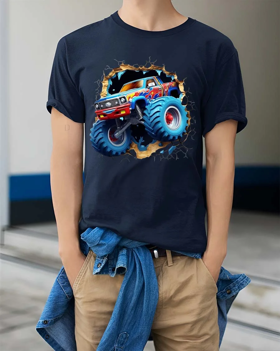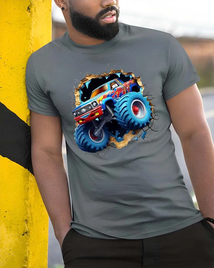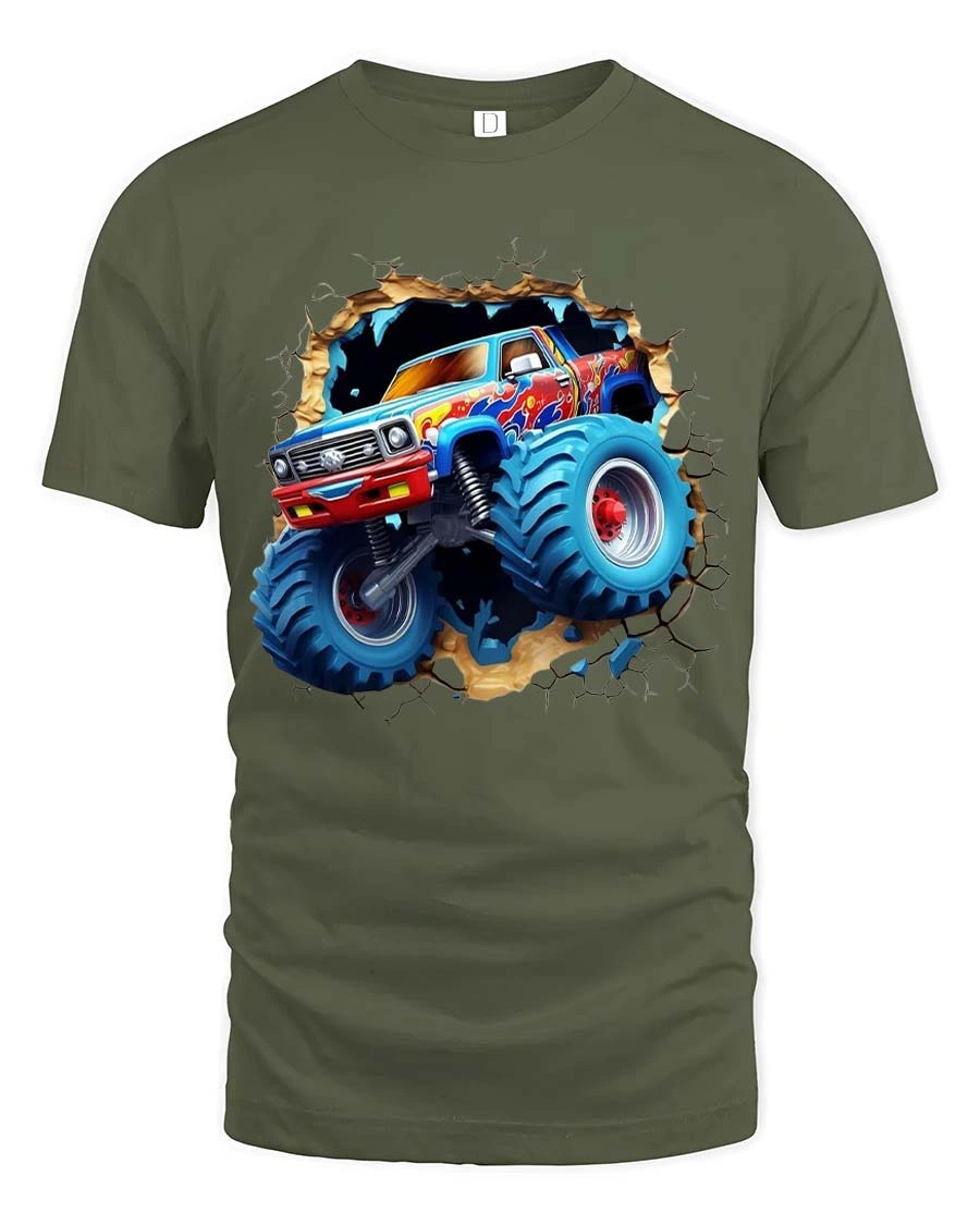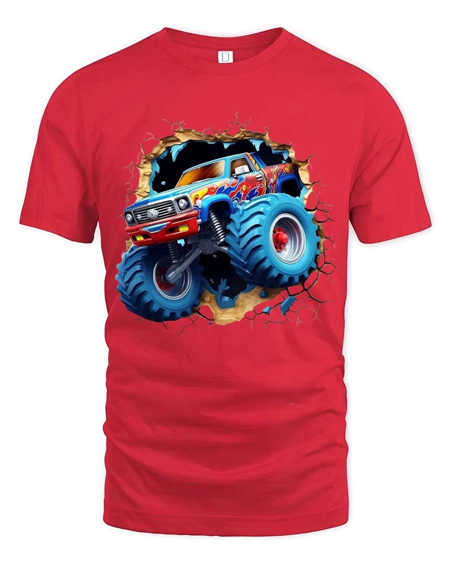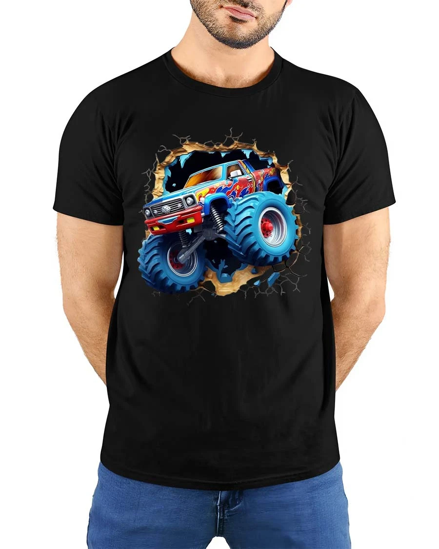 Monster Truck Breakthrough Graphic T Shirt Off Road Truck Tee features a powerful and dynamic design of a monster truck bursting through a wall with massive tires and bold colors.