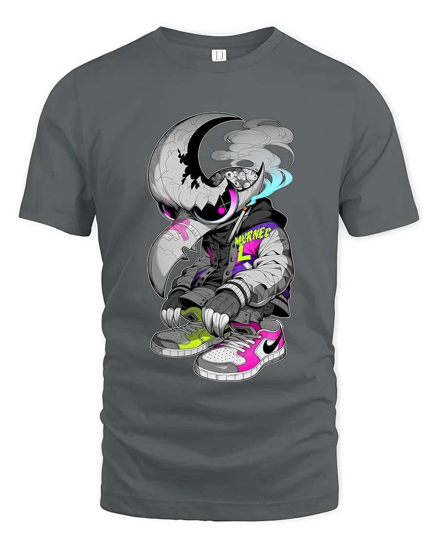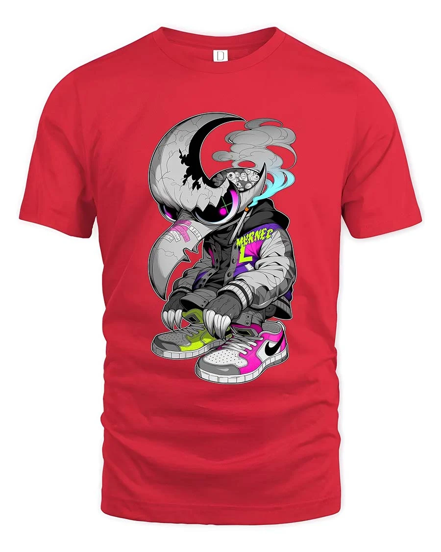 The stylized raven skull character paired with vibrant sneaker accents creates a bold and unique visual.