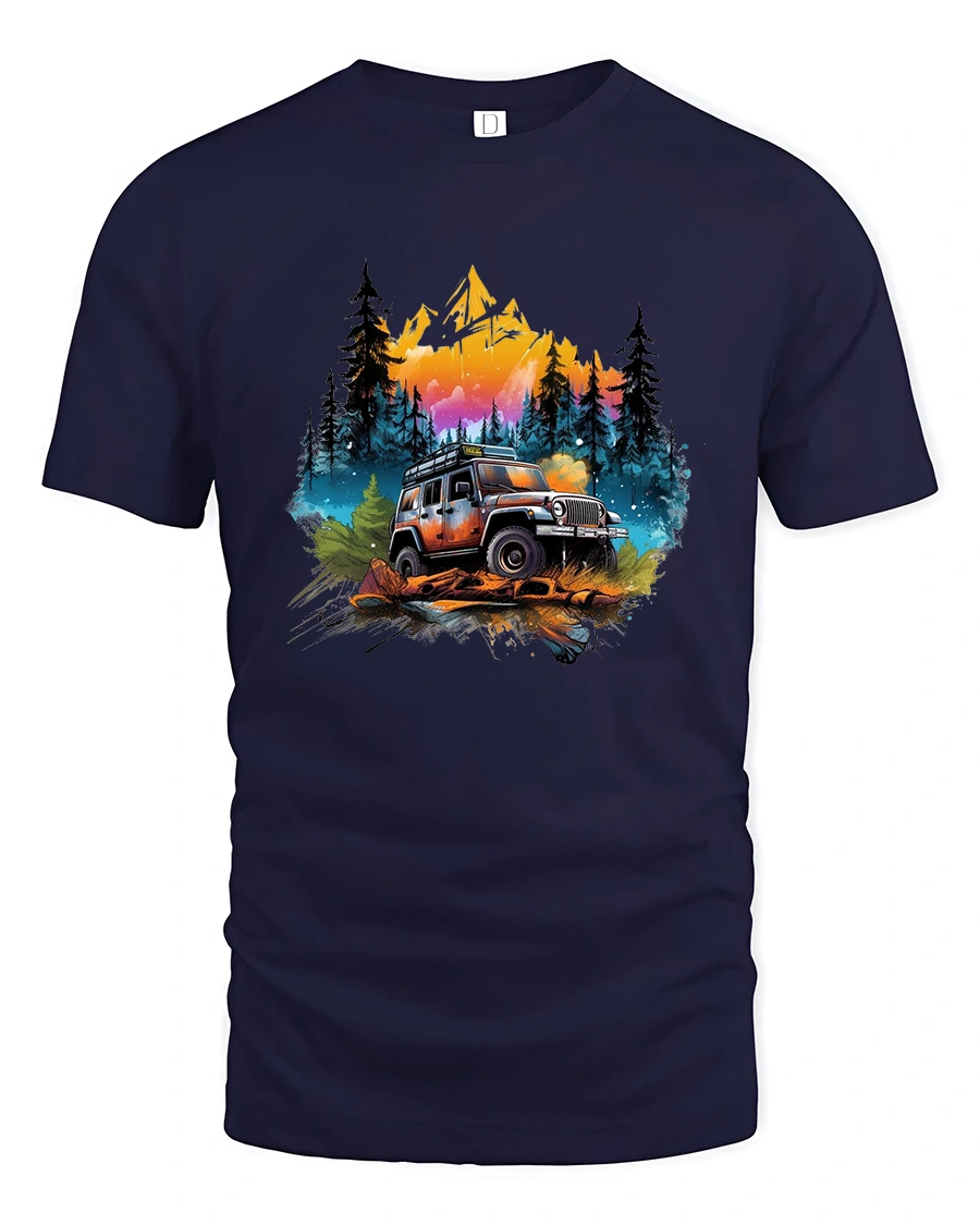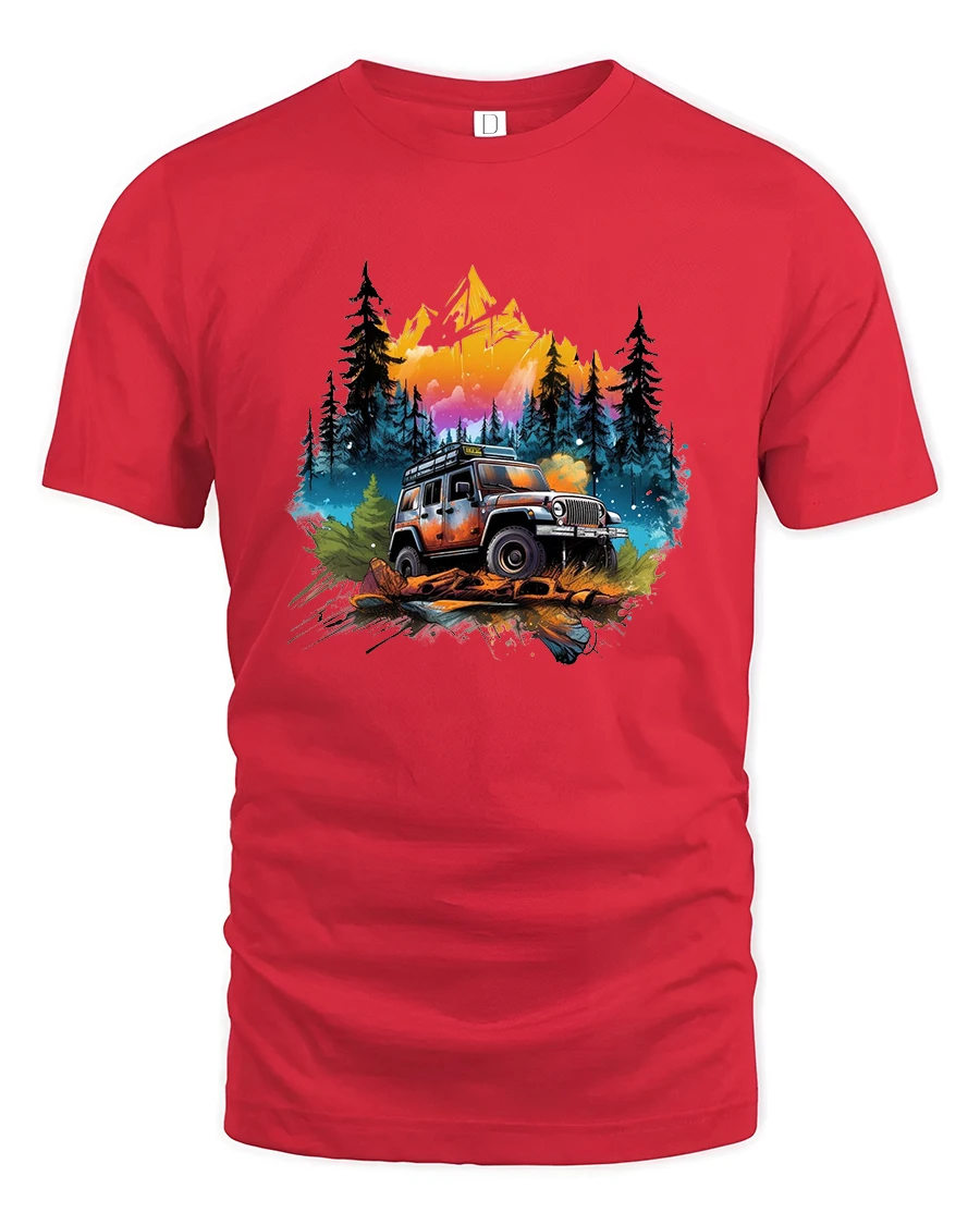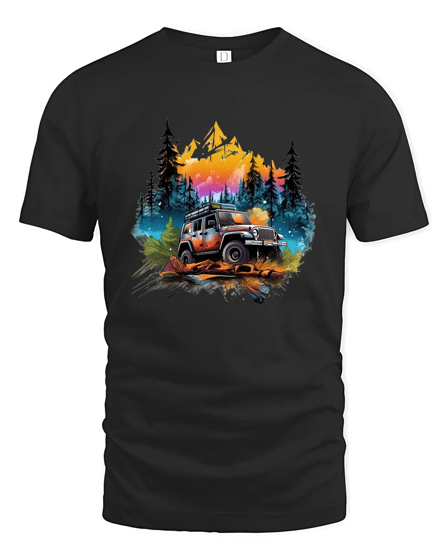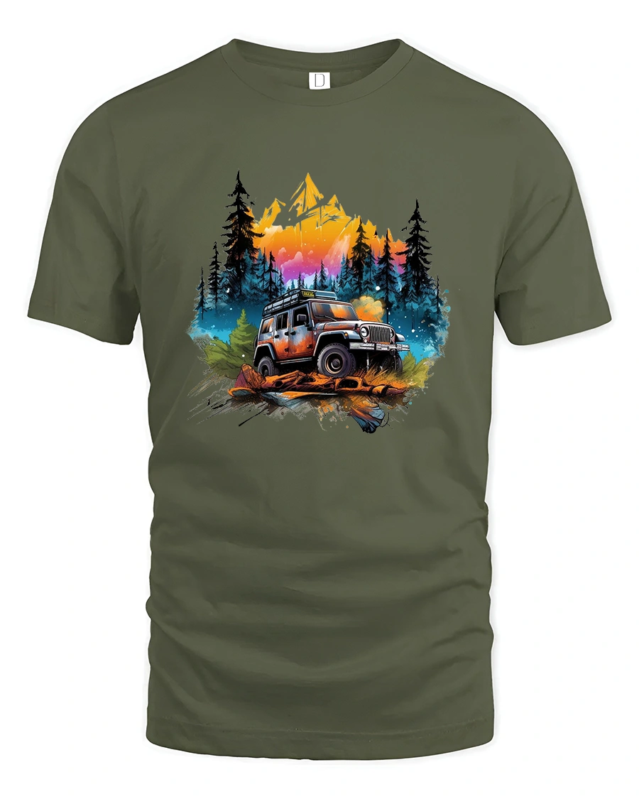 This Mountain Adventure Offroad Jeep Tee for Outdoor Explorers brings bold color, rugged style, and a sense of pure wilderness freedom to your wardrobe. The vibrant graphic features an offroad jeep powering through a forest trail with towering pine trees and striking golden mountains in the background. A sunset sky blends warm and cool tones, creating a dramatic scene that perfectly captures the spirit of adventure.