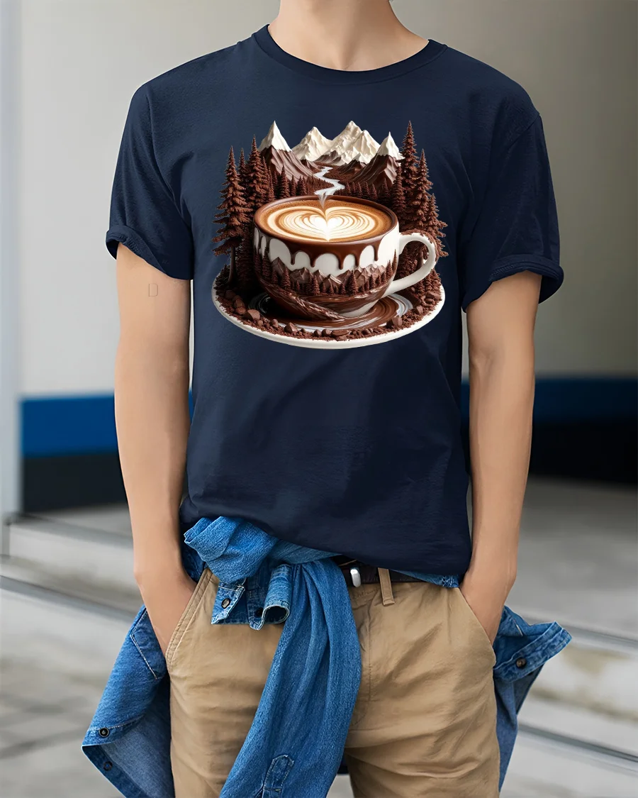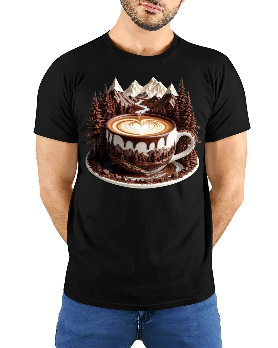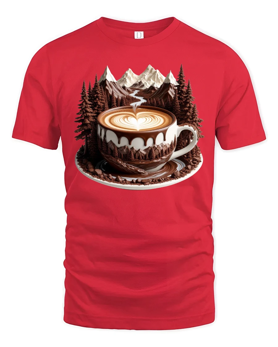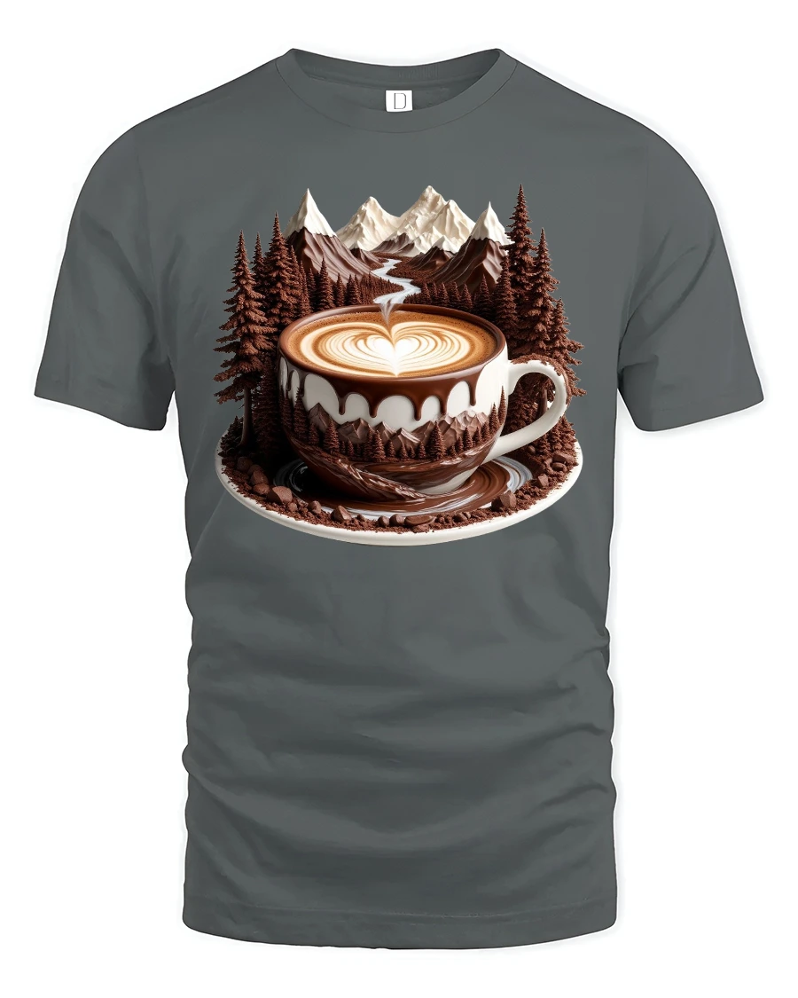 Mountain Coffee Art Graphic Tee With Scenic Latte Landscape Style blends creativity, nature, and cozy café vibes into one stunning design. The artwork features a beautifully crafted latte inside a cup that transforms into a mountain valley, complete with flowing rivers, evergreen forests, and snow topped peaks. The clever blend of coffee and landscape elements creates a dreamy, imaginative scene that instantly captures attention. Made with soft material and rich printing, this tee provides long lasting comfort and vivid detail.