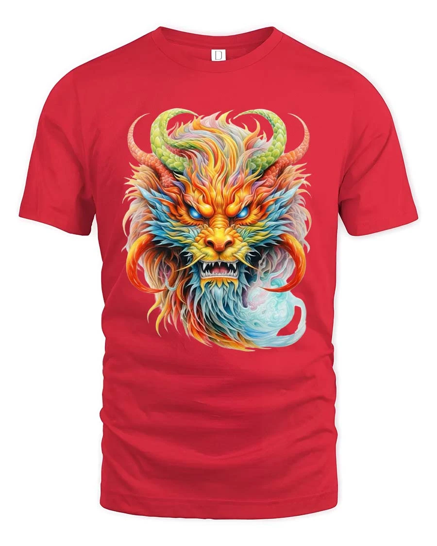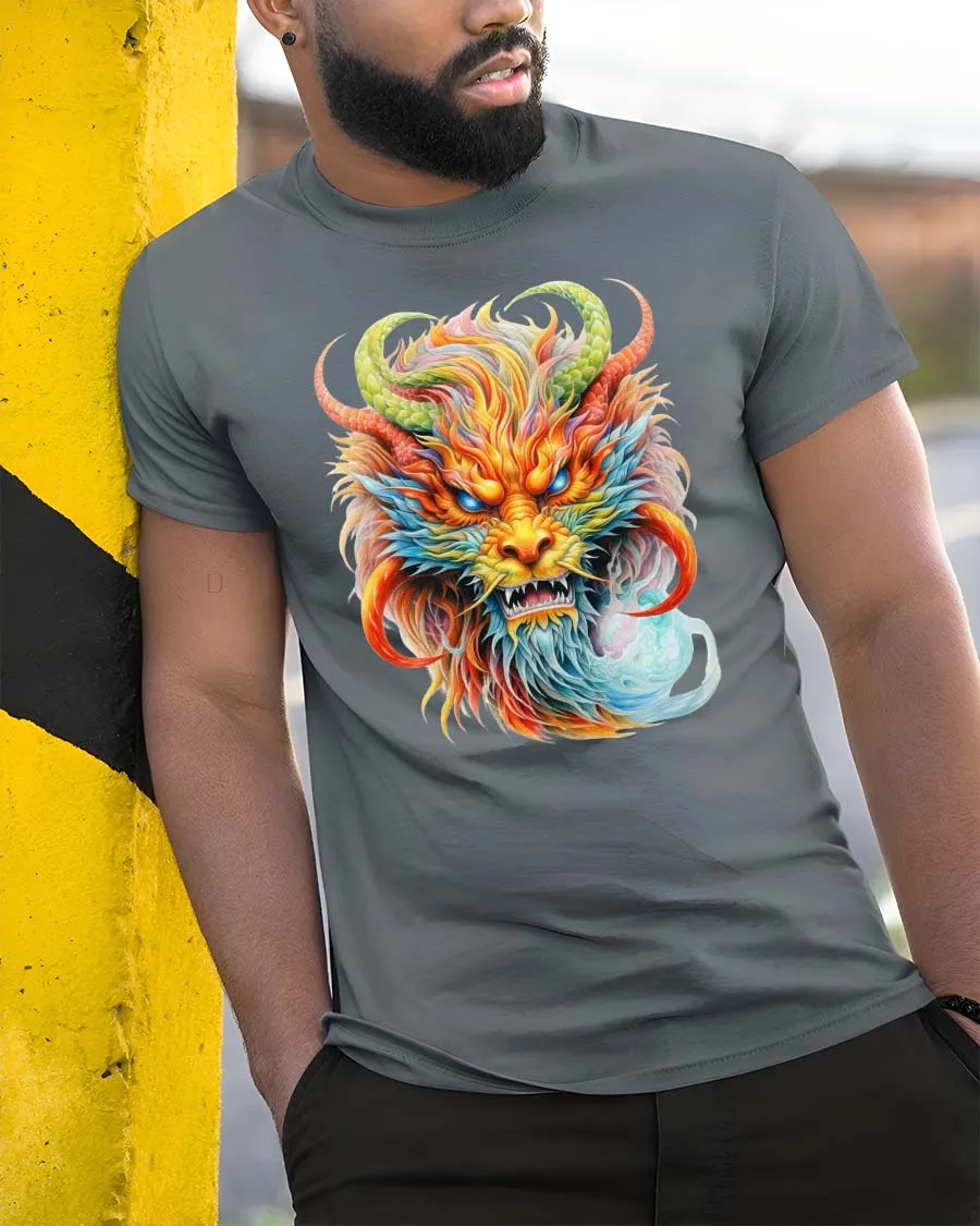 The Mystic Rainbow Dragon Head Graphic Fantasy Art T Shirt features a stunning illustration of a powerful mythical dragon brought to life with vibrant colors and intricate details.