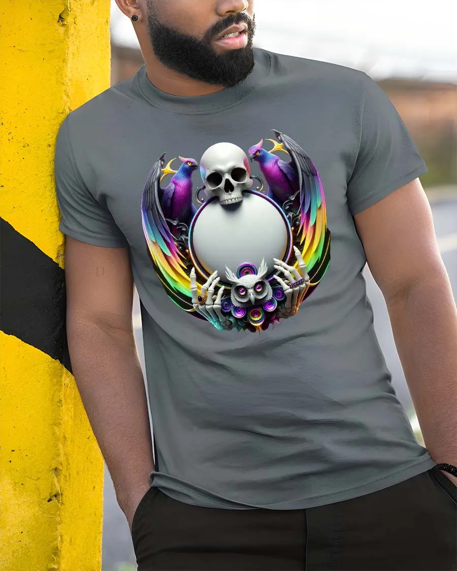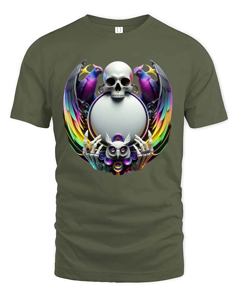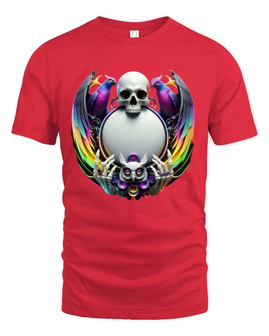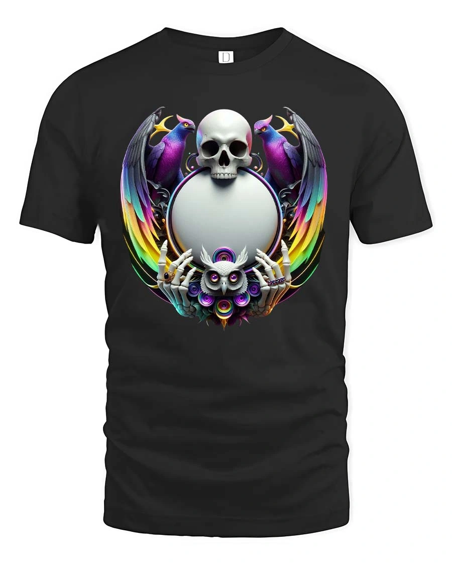 Mystic Skull With Owl and Rainbow Wings Gothic Art T Shirt features a striking fantasy design that blends gothic symbolism with vibrant artistic detail.