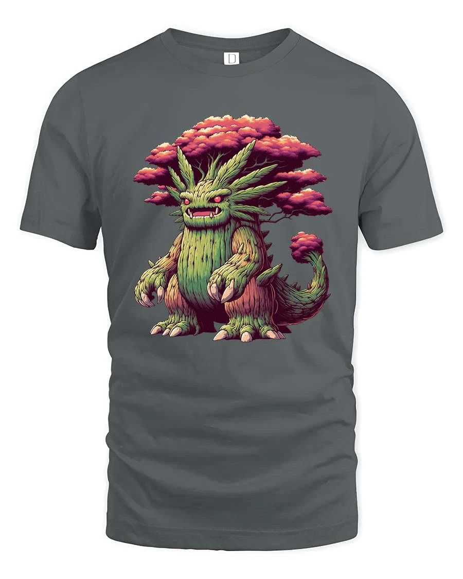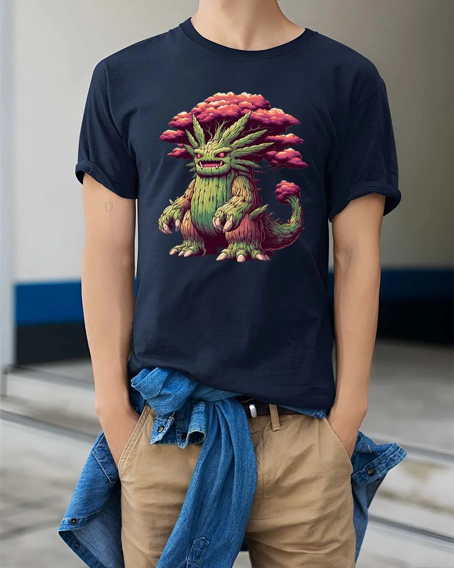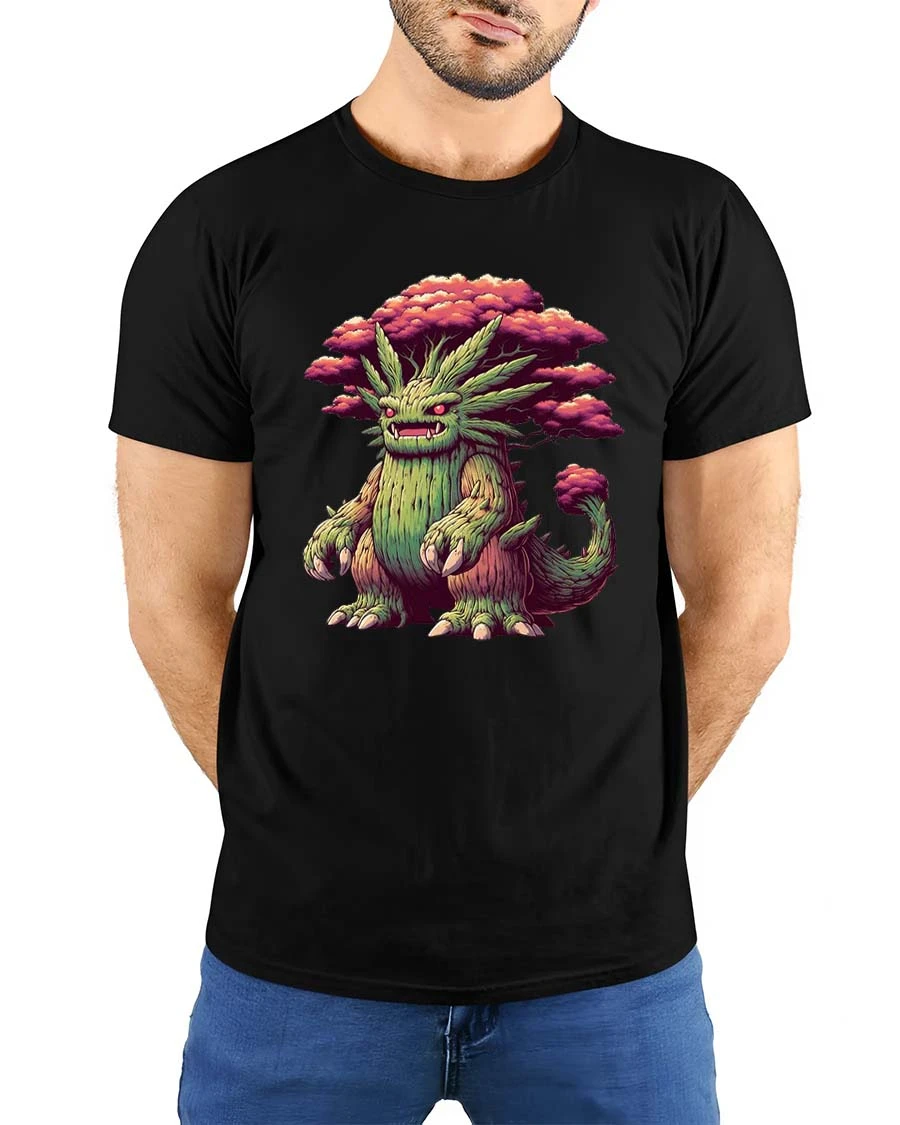 Mystical Tree Monster Fantasy Graphic T Shirt Nature Creature features a unique fantasy character that blends the power of nature with mythical imagination. The design shows a fierce yet fascinating tree creature with a body formed from bark, branches, and roots, crowned by vibrant forest foliage.