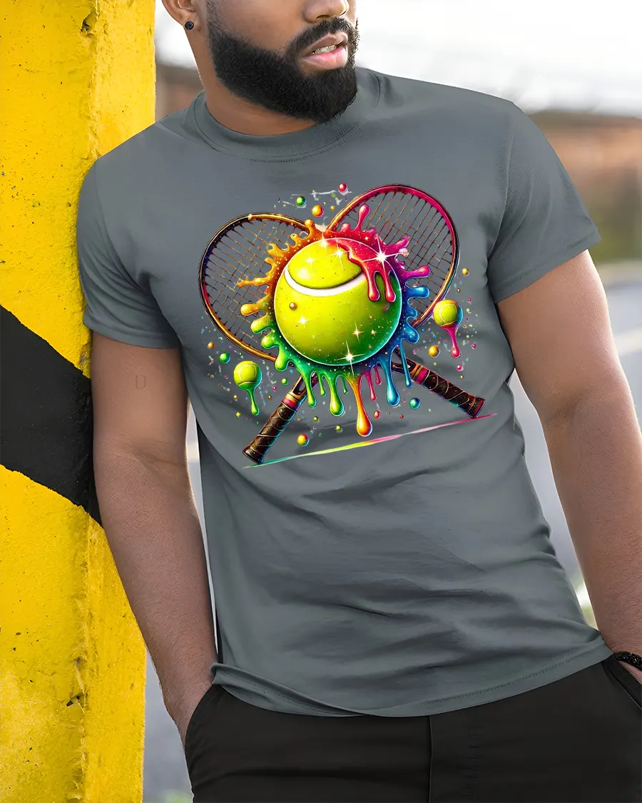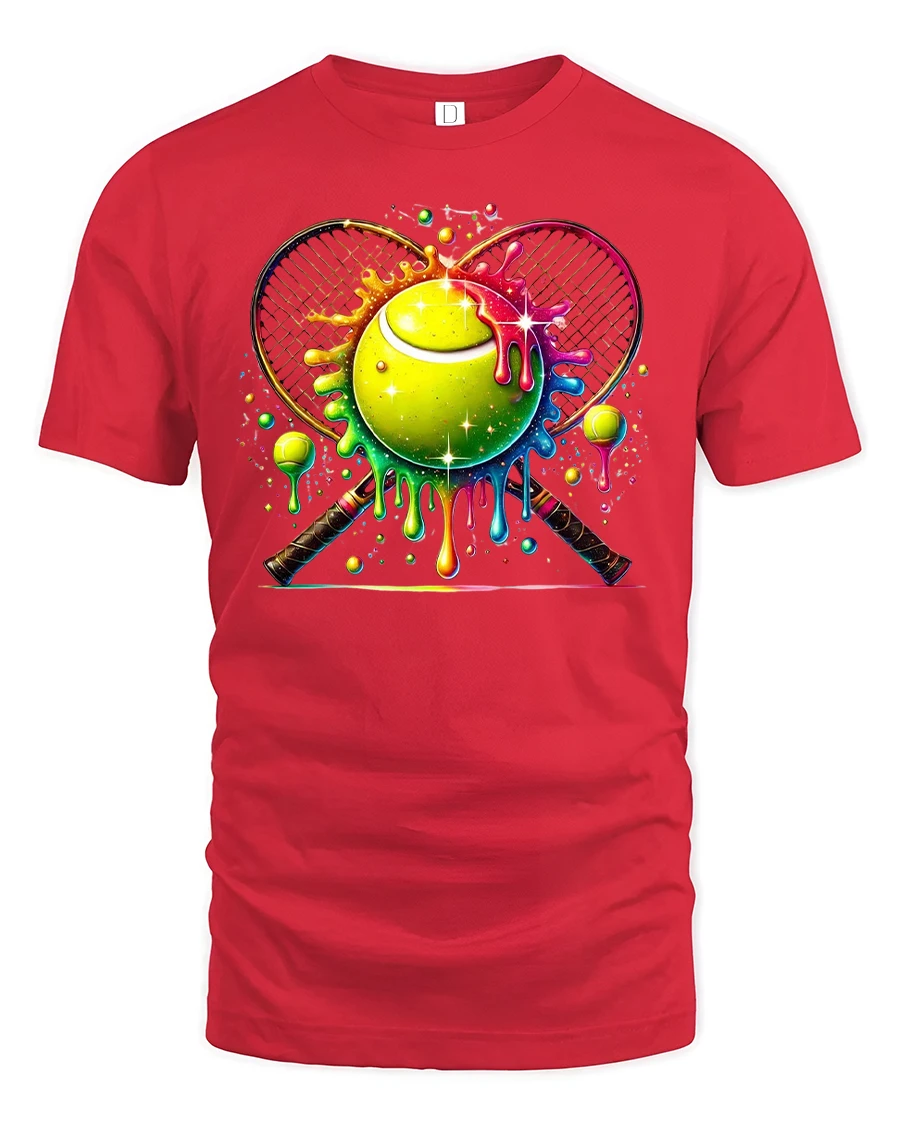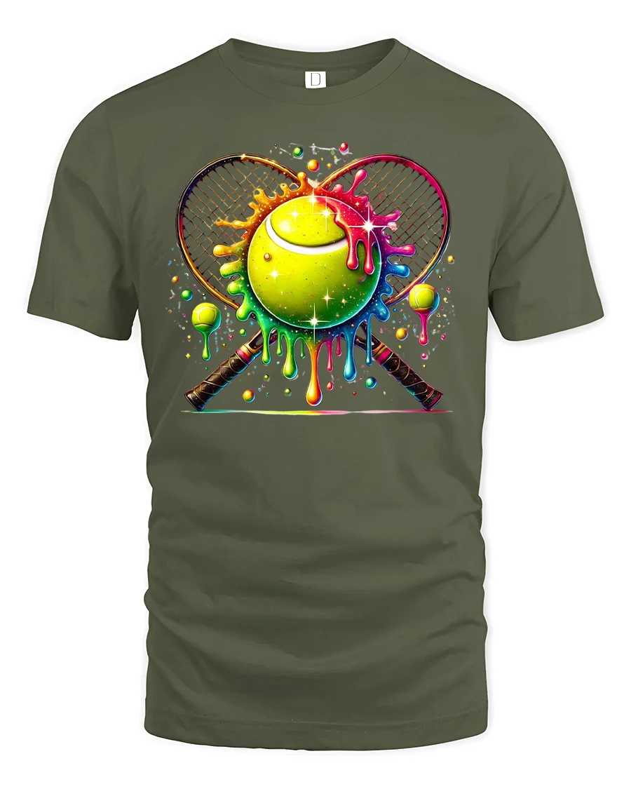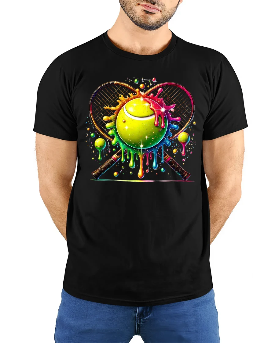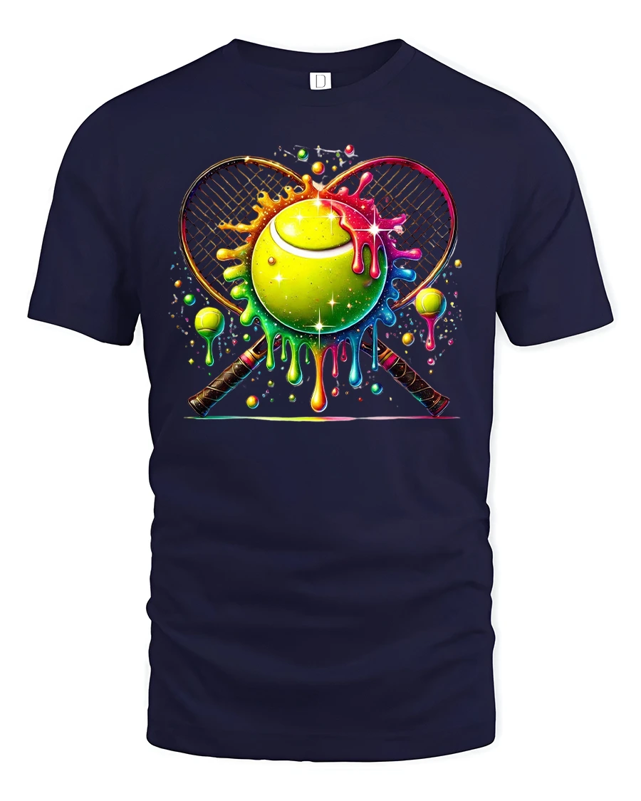 Featuring a bold neon tennis ball dripping with color and crossed rackets behind it, this tee turns your passion for the game into a wearable work of art.