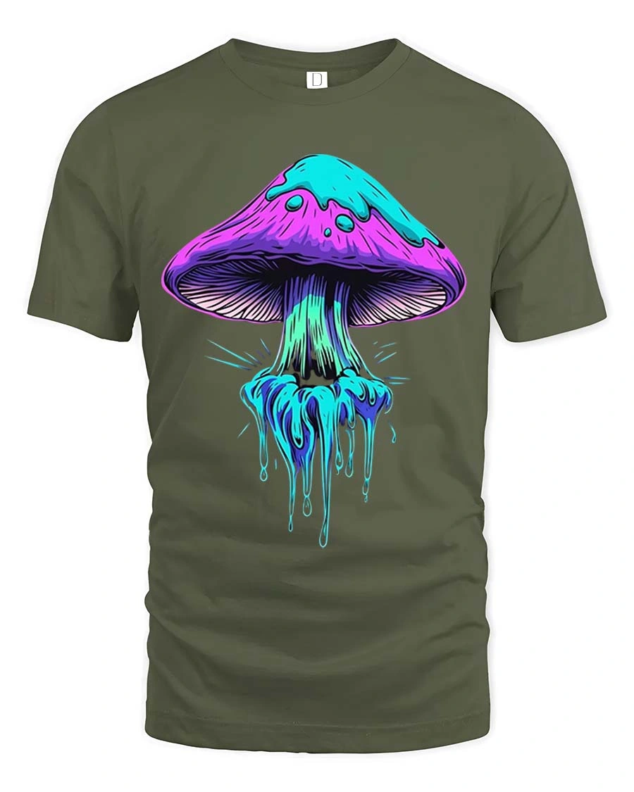 Neon Dripping Mushroom Psychedelic Art Graphic T Shirt - military green t-shirt on white background
