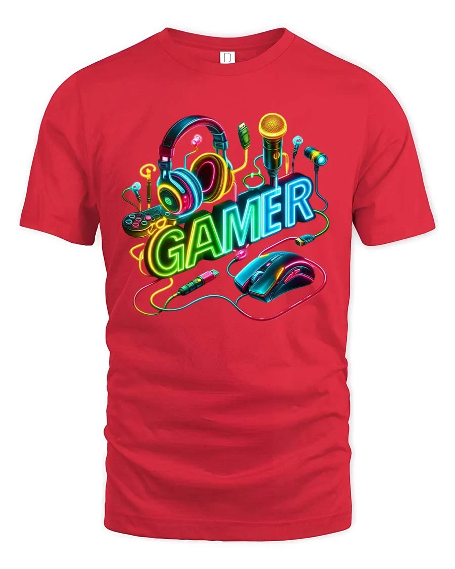 Neon Gamer Headset Graphic T Shirt Gaming Setup Style - red t-shirt on white background