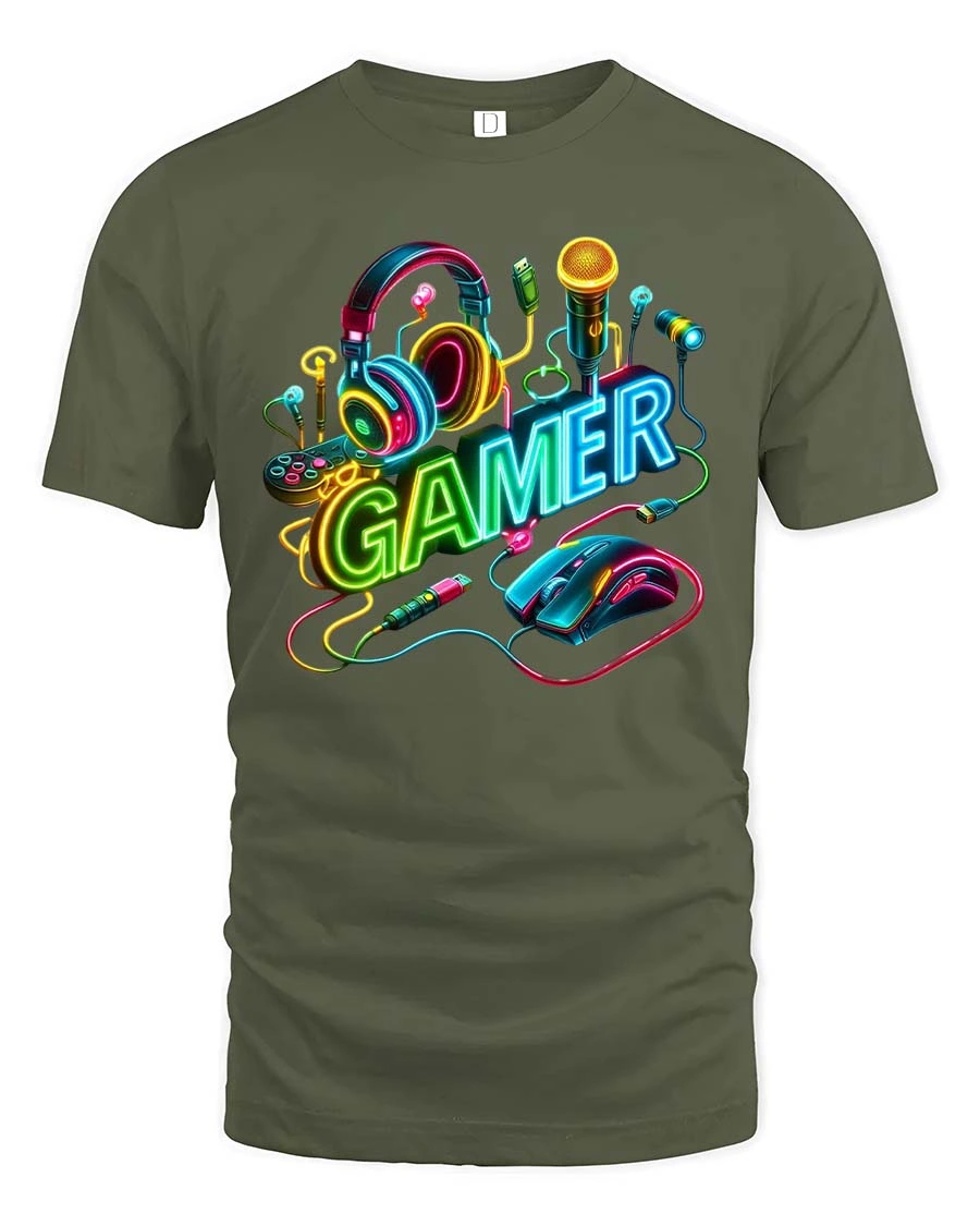 Neon Gamer Headset Graphic T Shirt Gaming Setup Style - military green t-shirt on white background