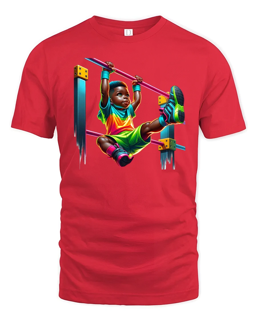 Step into bold urban style with the Neon Playground Kid Graphic Tee with Cool Vibes. Featuring a vibrant design of a child confidently hanging from colorful bars, this shirt bursts with energy and playful spirit. The neon-inspired details make it a true standout for anyone who loves artistic streetwear and eye-catching fashion.