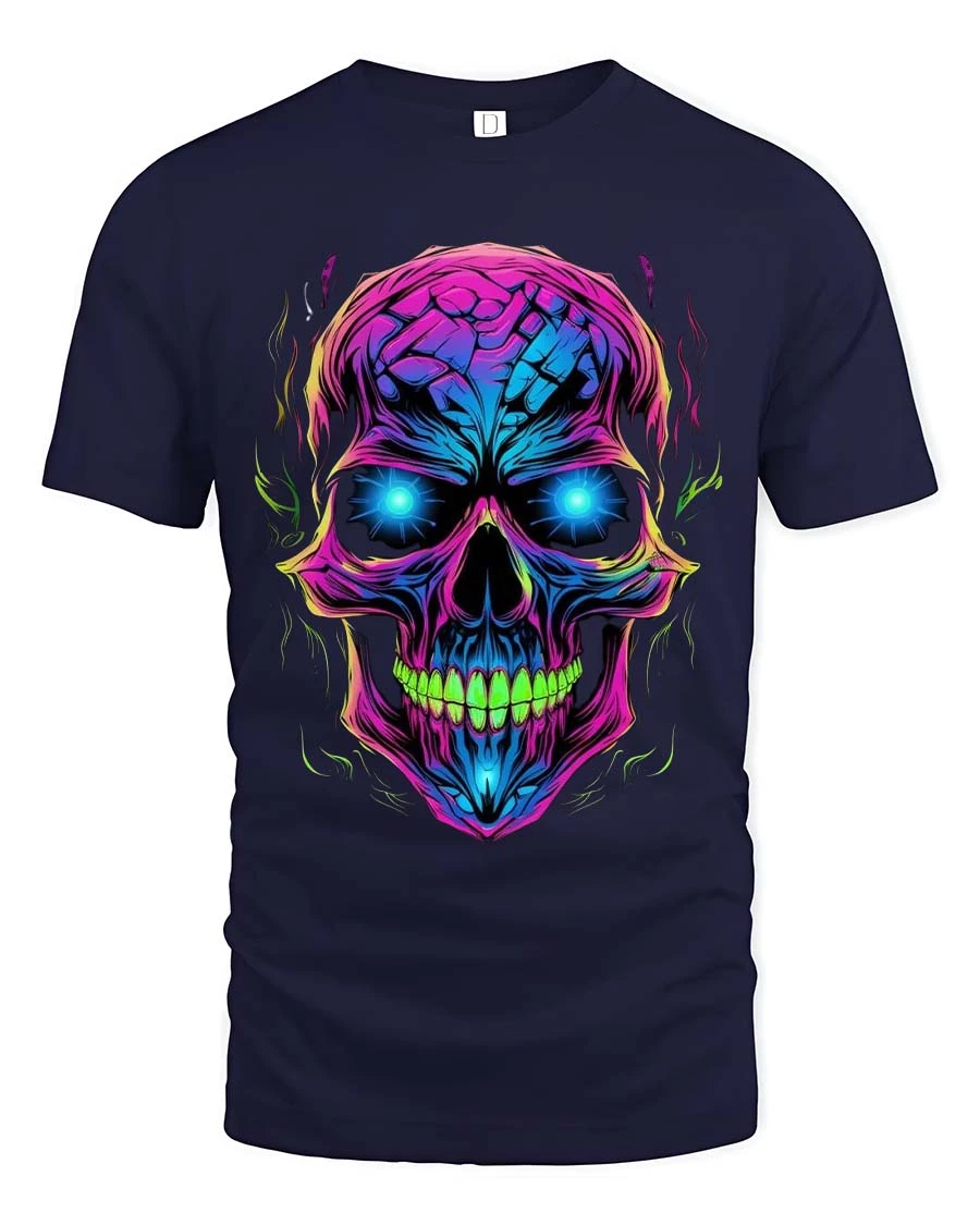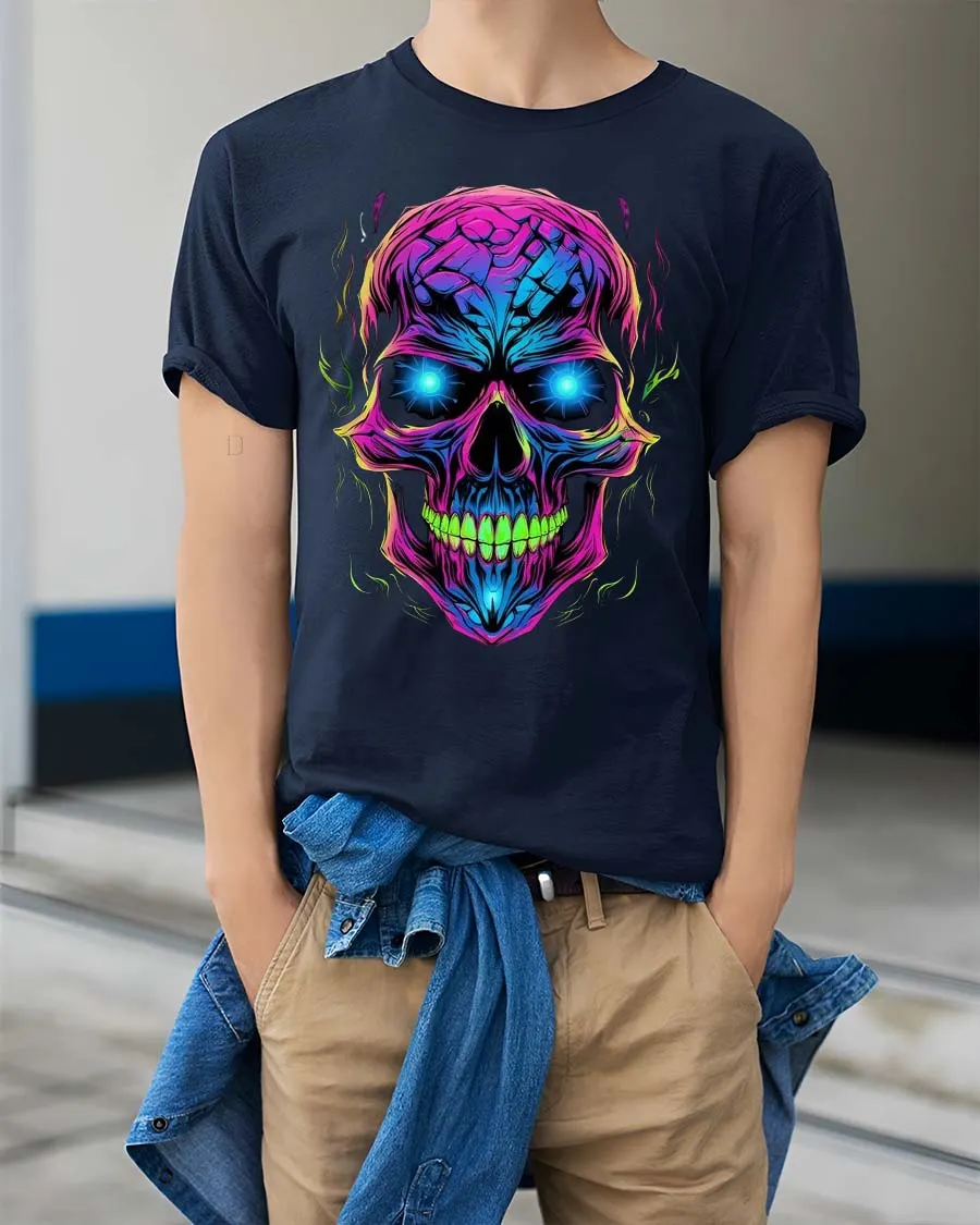 Neon Skull Glow Graphic T Shirt Cyber Punk Style Streetwear - navy t-shirt on white background