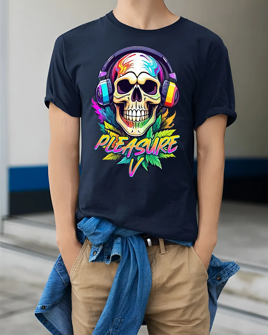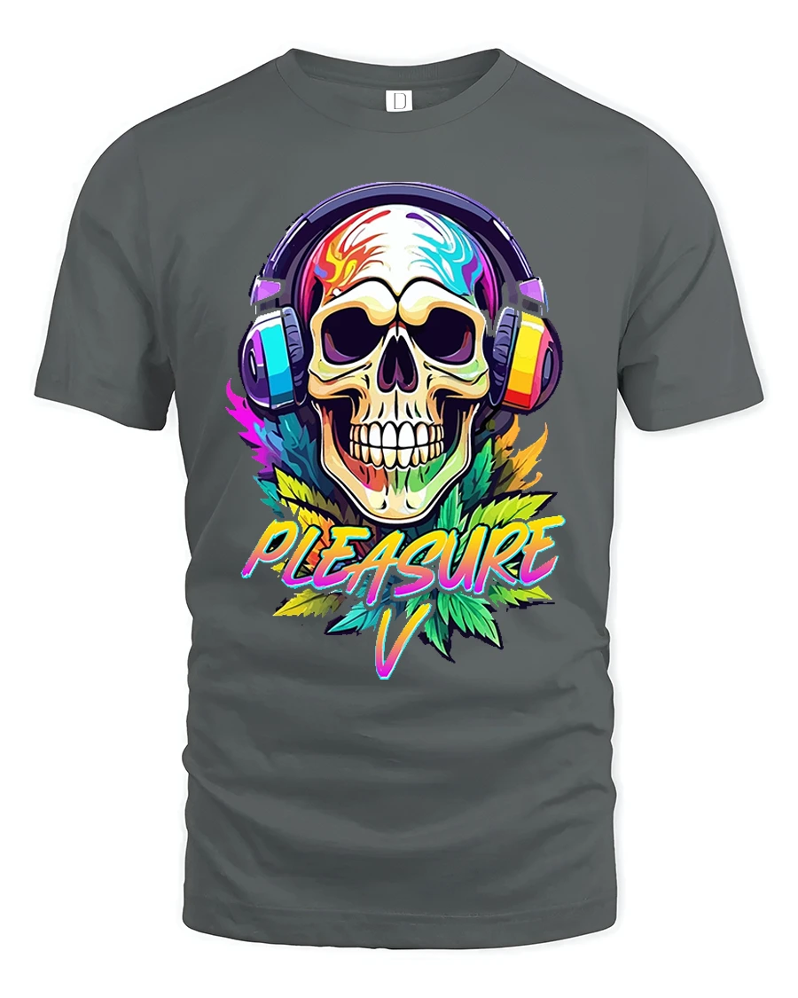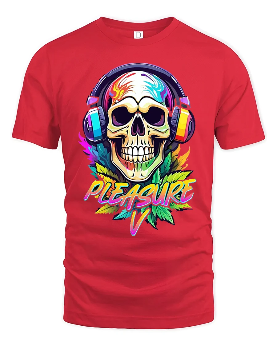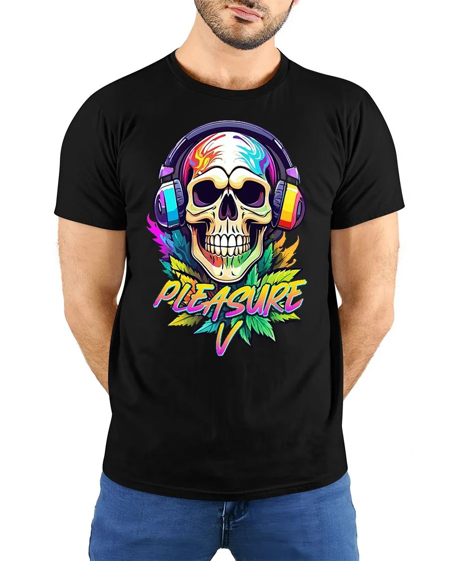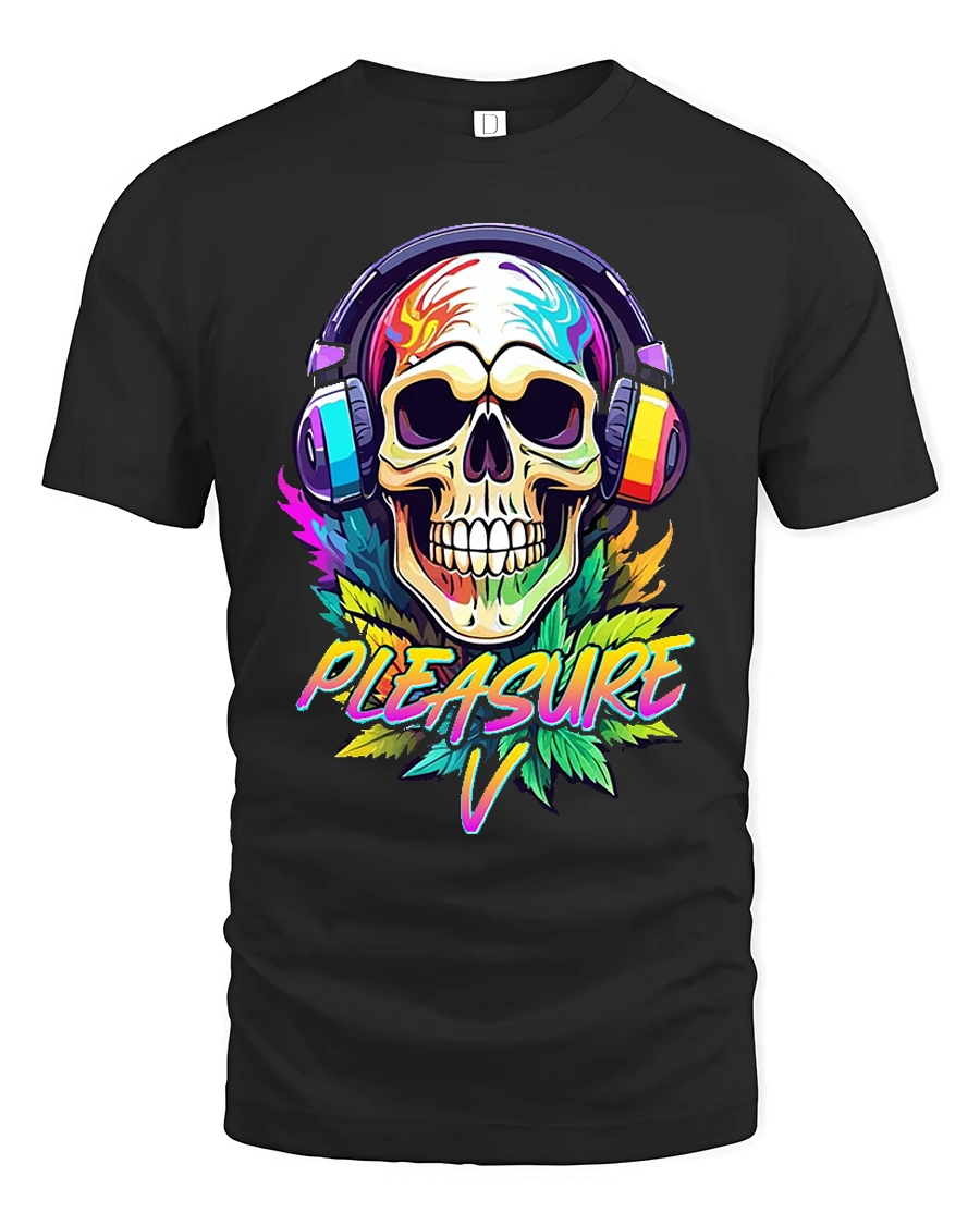 Featuring a vivid neon skull with headphones and colorful “Pleasure” text, this design fuses bold creativity with high-energy vibes.