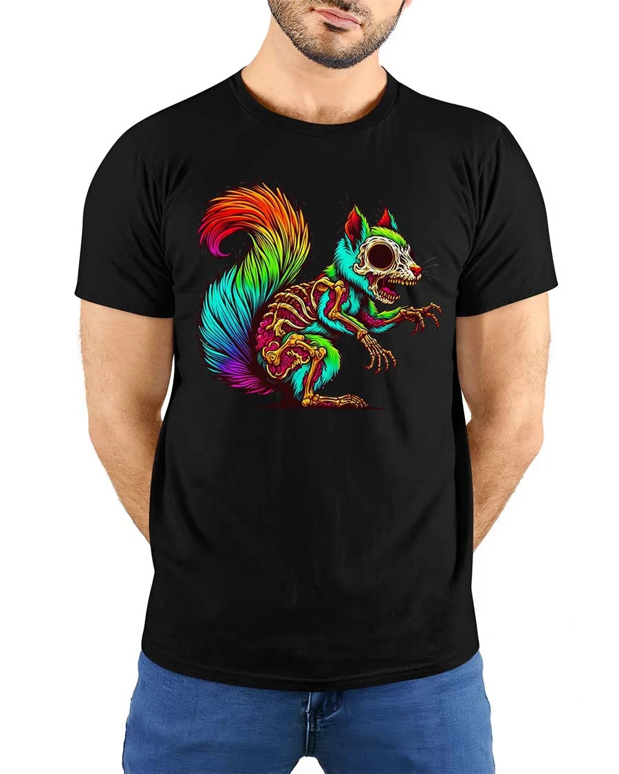 Neon Zombie Squirrel T Shirt Psychedelic Horror Animal Graphic Tee - model wearing black tee with hands behind back