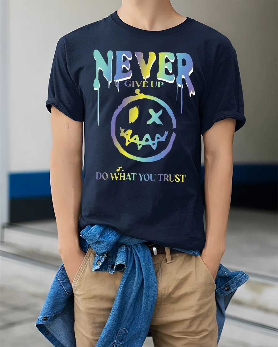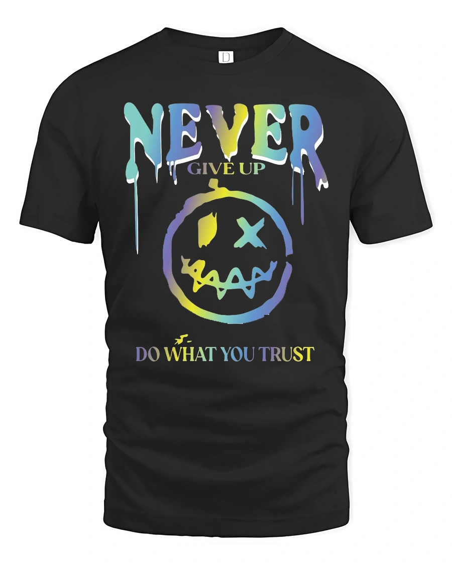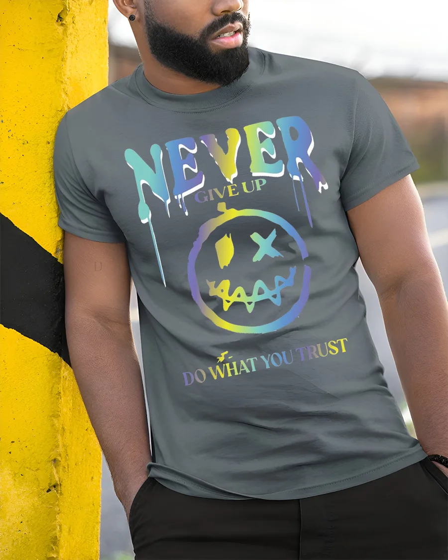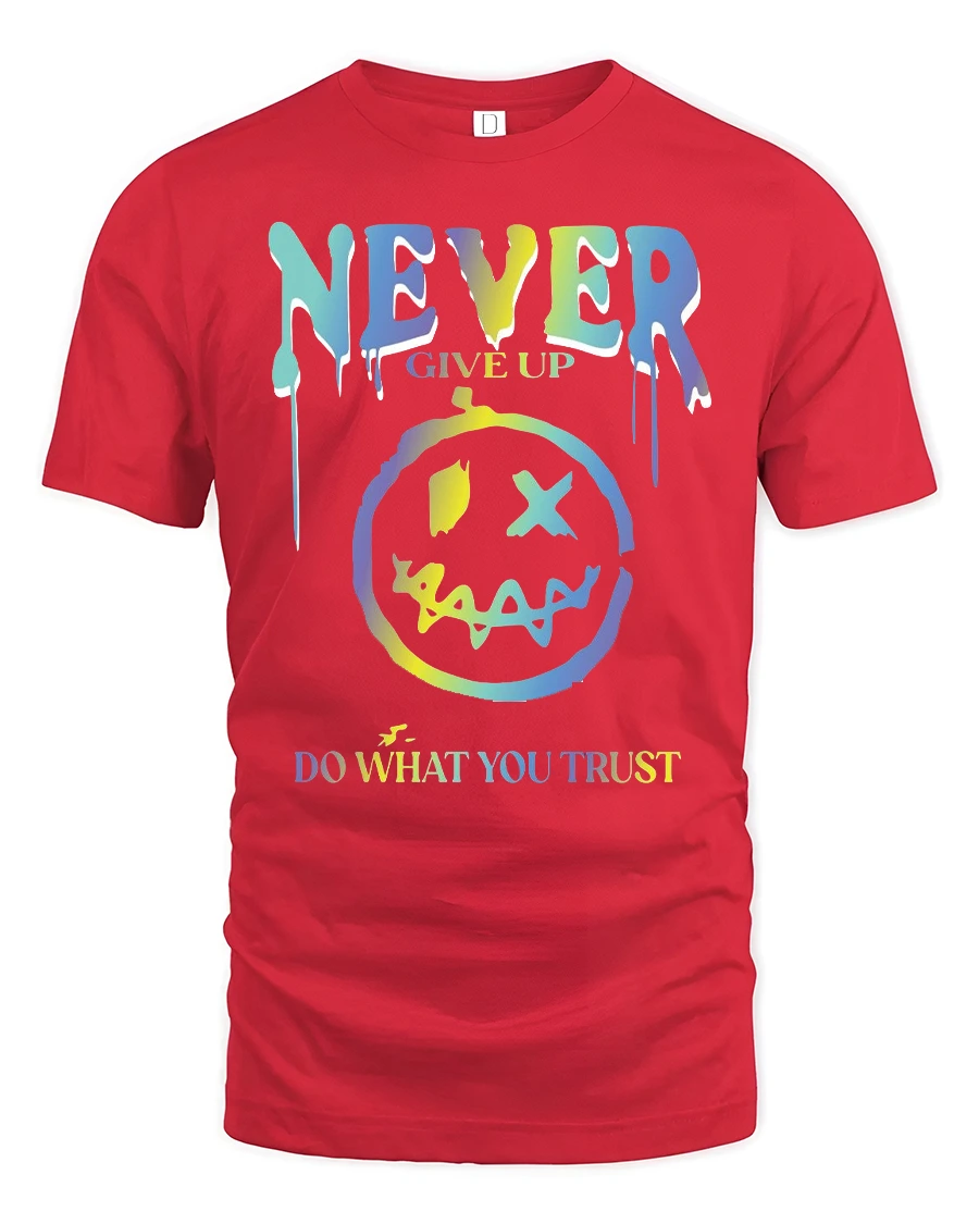 Push through every challenge with the Never Give Up Motivational Graphic Tee Street Style, designed to inspire confidence and bold energy wherever you go. This tee combines vibrant gradient lettering with an edgy smiley face design, making it perfect for anyone who loves unique fashion with a powerful message.