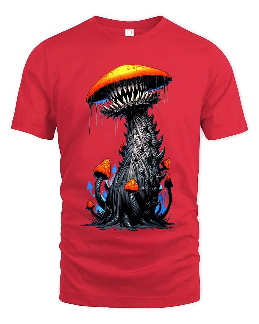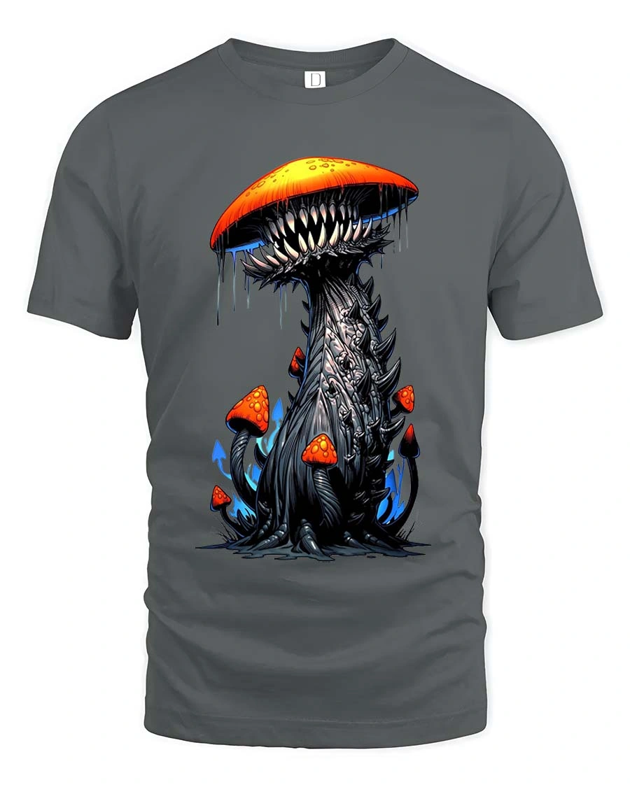 This striking design features a surreal mushroom creature with sharp teeth and eerie details that instantly capture attention.