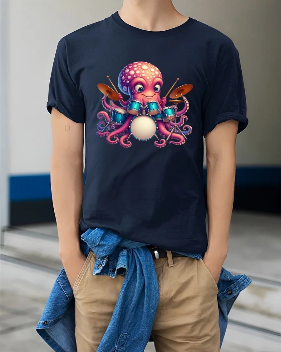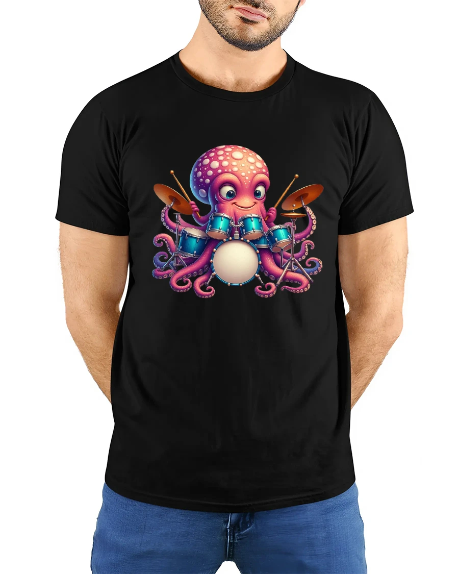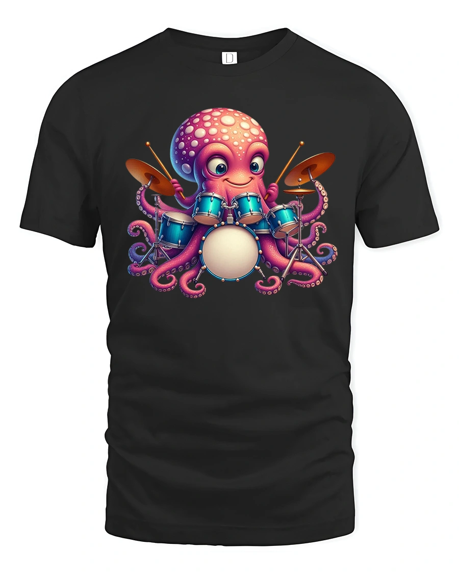 Featuring an adorable cartoon octopus rocking a full drum set, this tee brings playful energy to any outfit. The bright colors and expressive character design make it a standout piece for drummers, musicians, ocean lovers, or anyone who enjoys cute and unique artwork on their clothing.