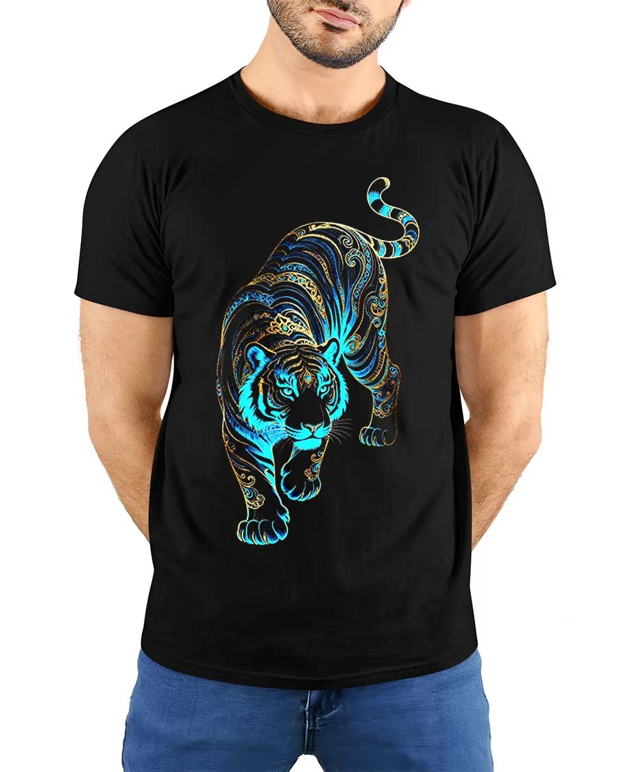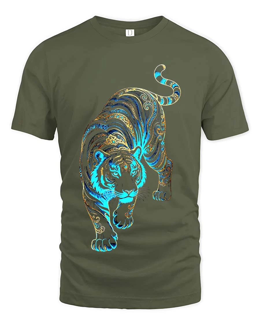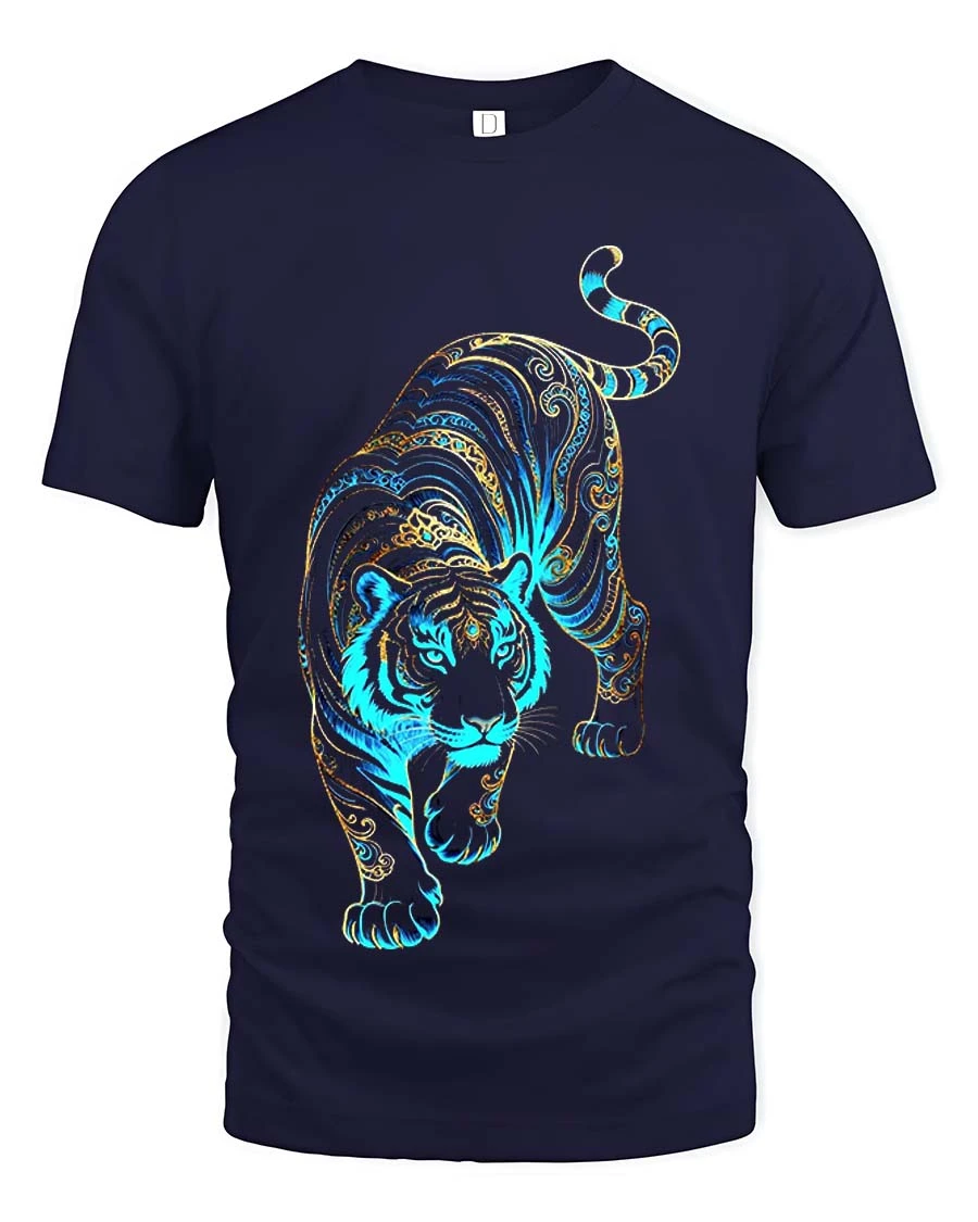 This Ornate Tiger Blue Gold Pattern Graphic T Shirt Bold Style showcases a stunning fusion of elegance and power through intricate design.