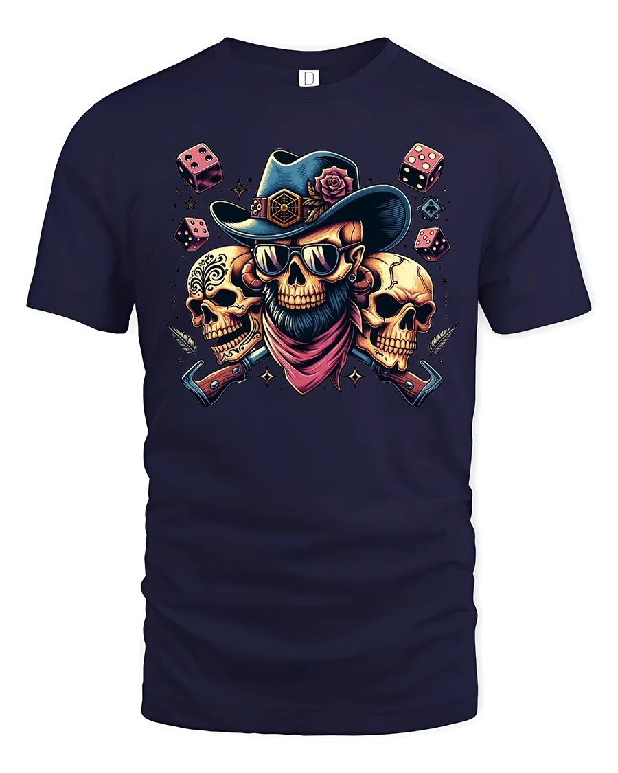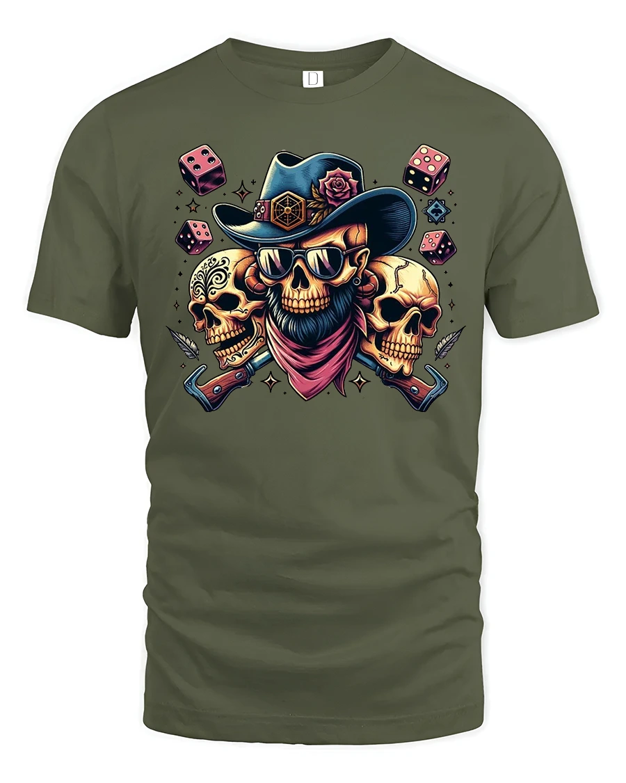 Outlaw Skull Cowboy Dice Graphic Tshirt Bold Western Style is ideal for those who appreciate edgy western themes and bold graphic art.