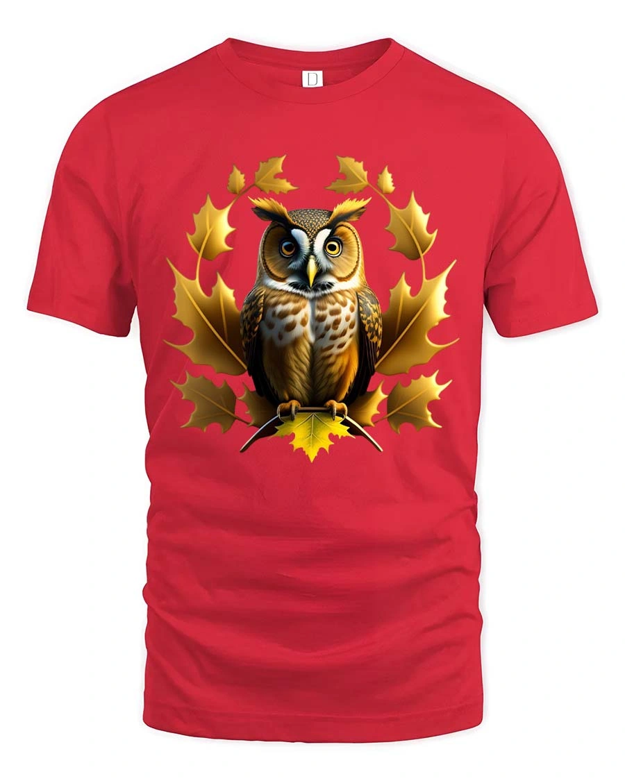Owl Autumn Leaves Graphic T Shirt Elegant Nature Wildlife Art - red t-shirt on white background
