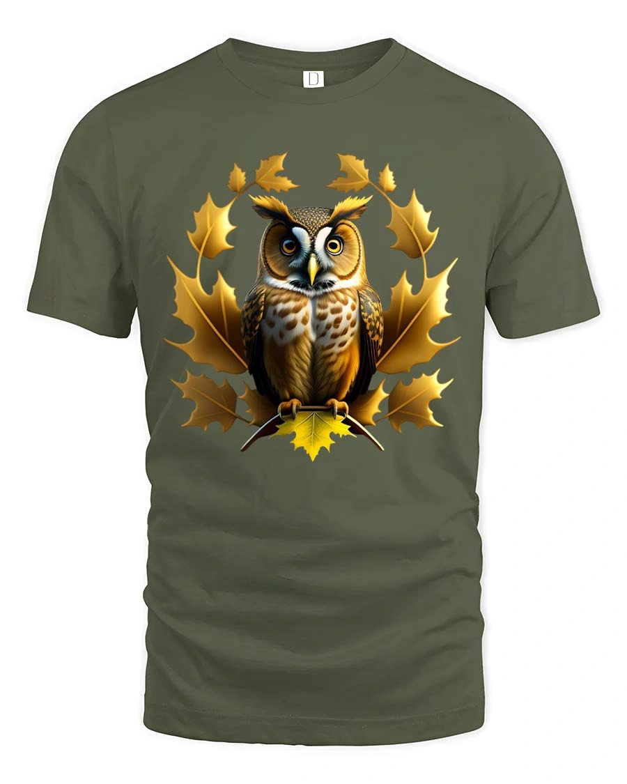Owl Autumn Leaves Graphic T Shirt Elegant Nature Wildlife Art - military green t-shirt on white background