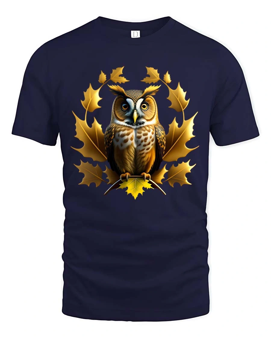 Owl Autumn Leaves Graphic T Shirt Elegant Nature Wildlife Art - navy t-shirt on white background
