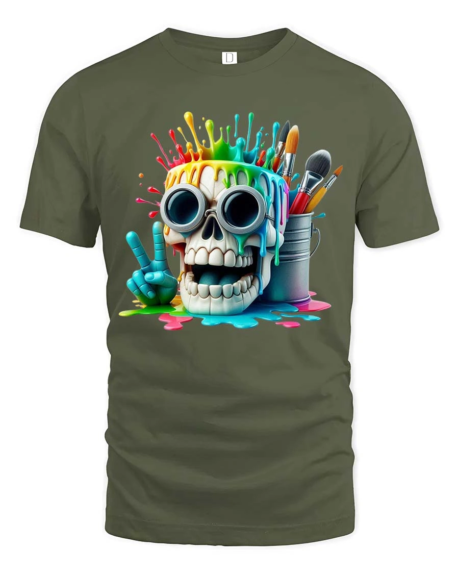 Paint Splash Skull T Shirt Funny Artist Graphic Colorful Tee - military green t-shirt on white background