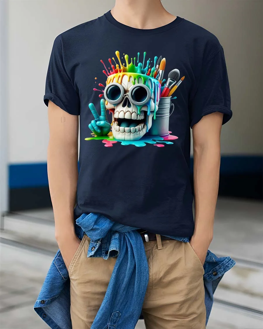 Paint Splash Skull T Shirt Funny Artist Graphic Colorful Tee - model wearing navy tee with hands in pockets