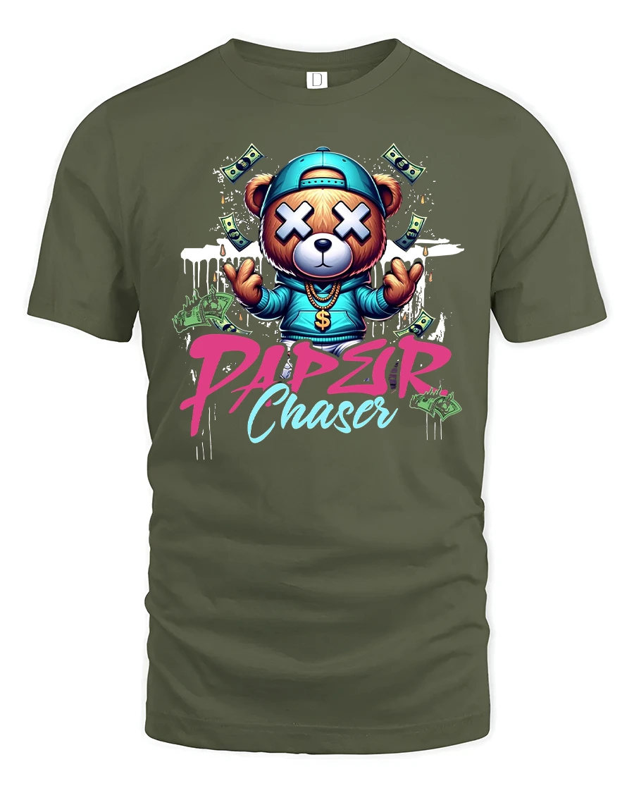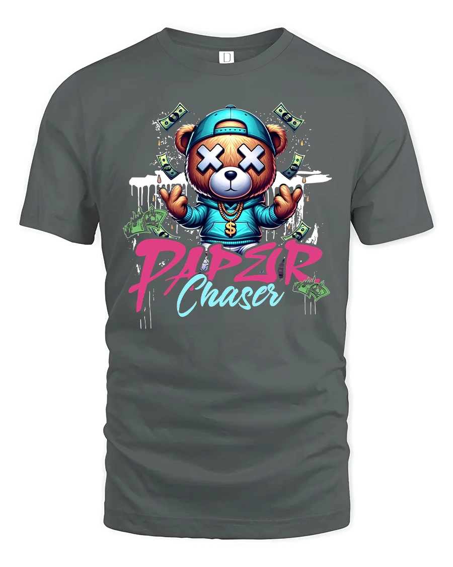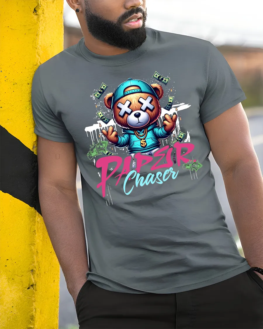 Turn heads with the bold style of the Paper Chaser Bear Graphic Tee Hip Hop Streetwear, designed for those who hustle hard and love to show it. Featuring a trendy bear in streetwear fashion surrounded by dollar bills, this tee captures the essence of ambition and grind in a fun and stylish way.