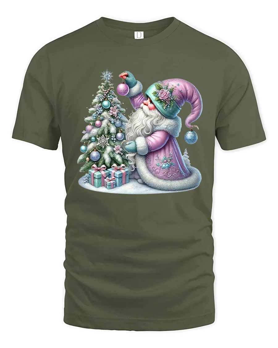 This Pastel Christmas Santa Decorating Tree Winter Magic Graphic Tee captures the soft charm of the holiday season with its sweet pastel colors and heartwarming scene. Featuring Santa in a beautifully detailed pink and teal outfit placing ornaments on a snowy Christmas tree, the artwork brings a whimsical elegance to classic holiday imagery. The frosted branches, sparkling baubles, and neatly wrapped presents create a magical winter atmosphere that feels cozy and festive.