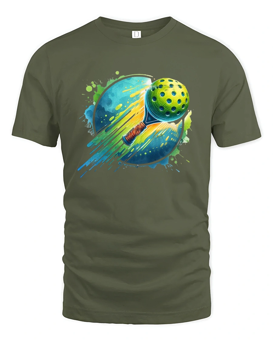 Pickleball T-Shirt Splash Art Funny Sports Graphic Tee - military green t-shirt on white background
