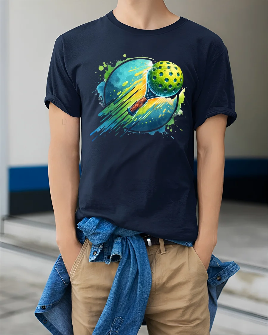 Pickleball T-Shirt Splash Art Funny Sports Graphic Tee - model wearing navy tee with hands in pockets