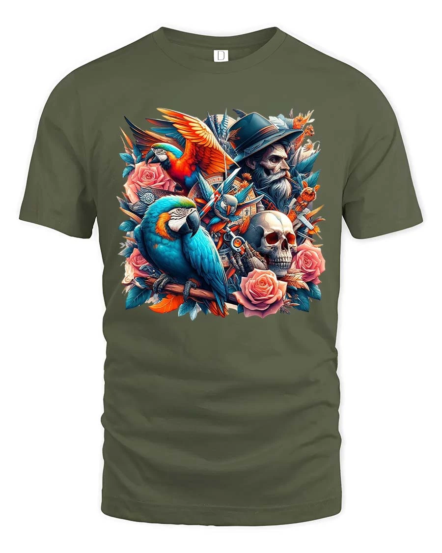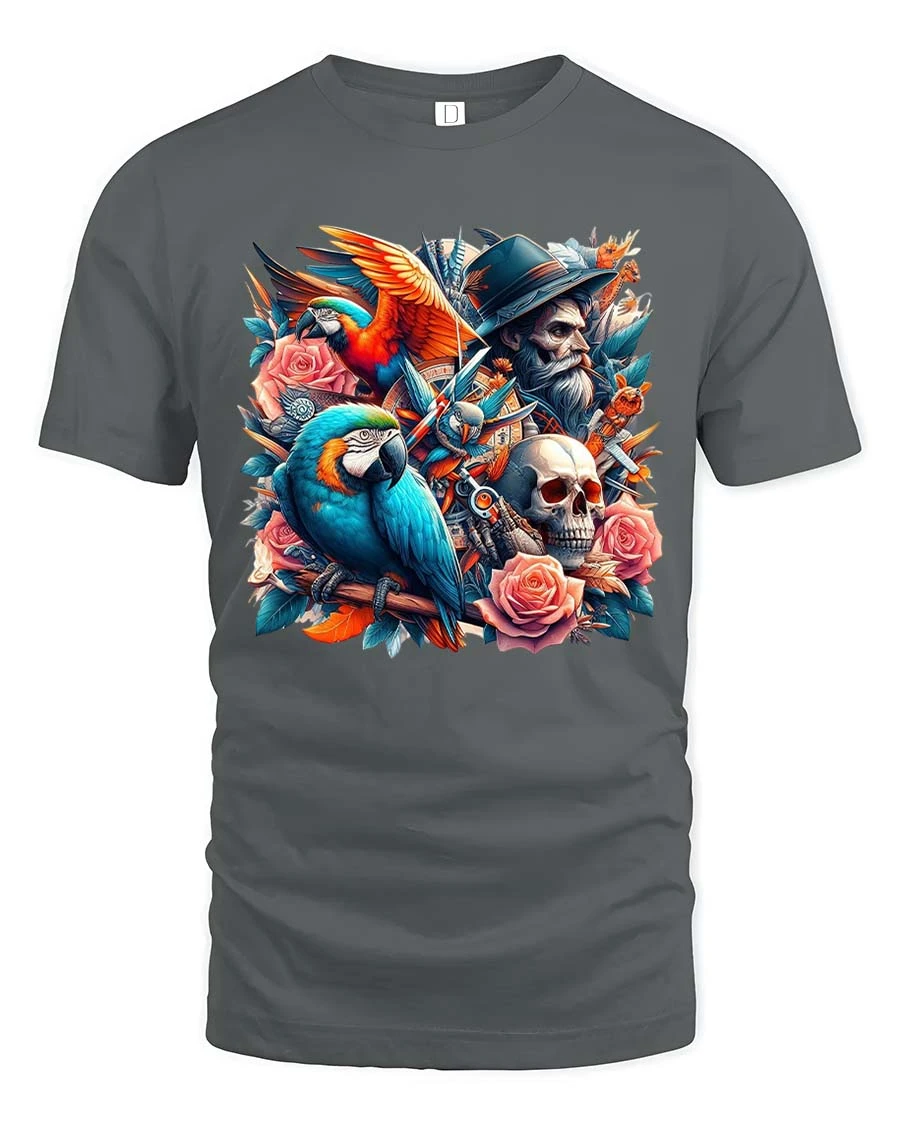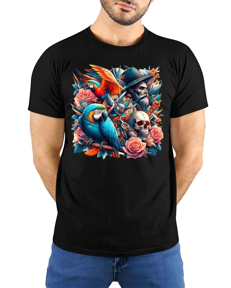 Pirate Parrot Skull T-Shirt Roses Vintage Tattoo Art Tee combines bold artistic elements into a striking and detailed design.