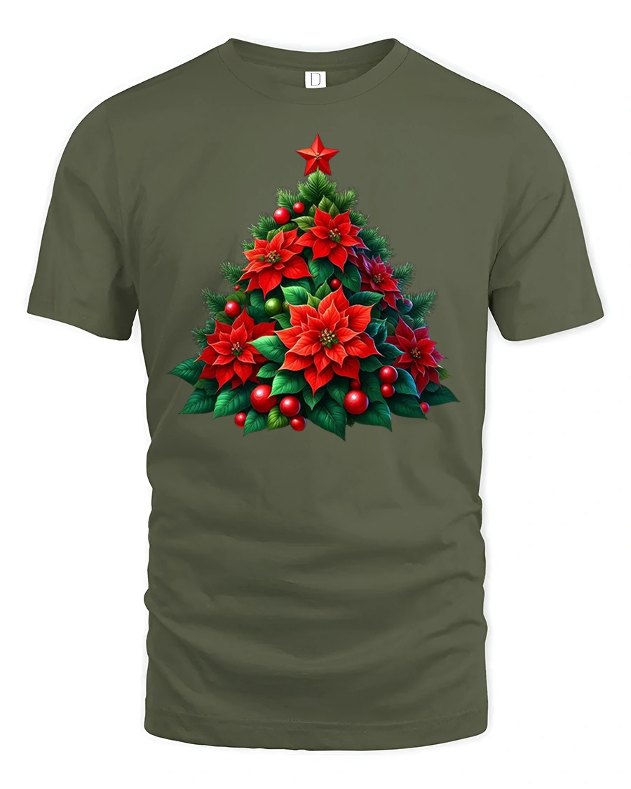 Featuring a striking tree design created entirely from bright red poinsettias, lush evergreens, and cheerful berries, this tshirt captures the classic beauty of Christmas decor. The vivid details and vibrant colors make this tee ideal for family gatherings, Christmas dinners, holiday photos, or a touch of seasonal style during winter outings.