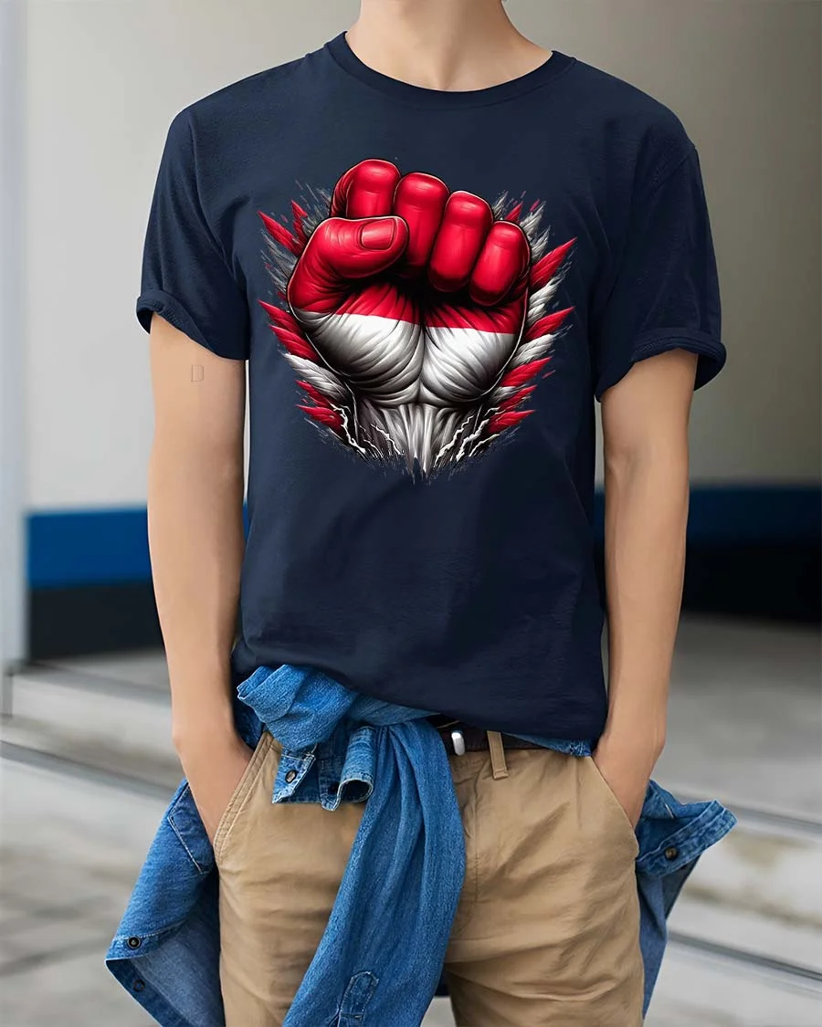 Powerful Red White Fist T Shirt Bold Strength Statement Graphic - model wearing navy tee with hands in pockets