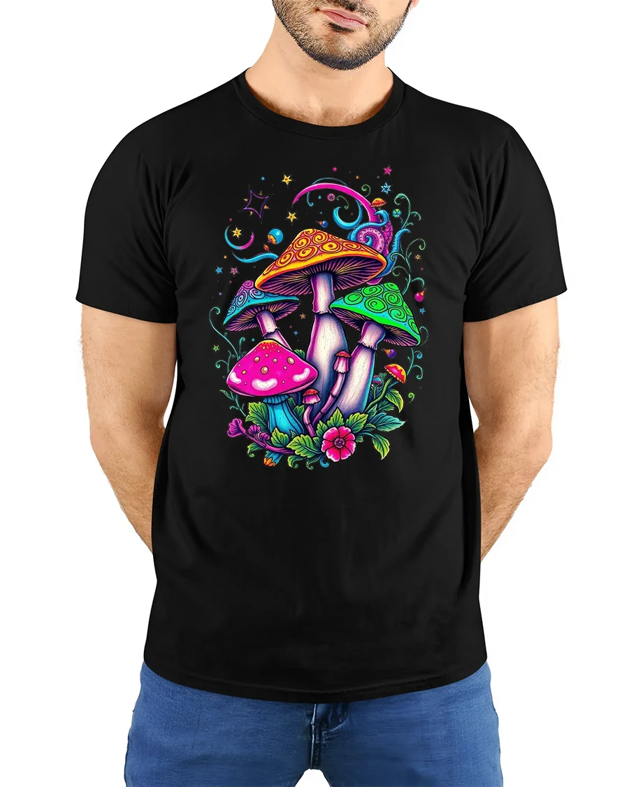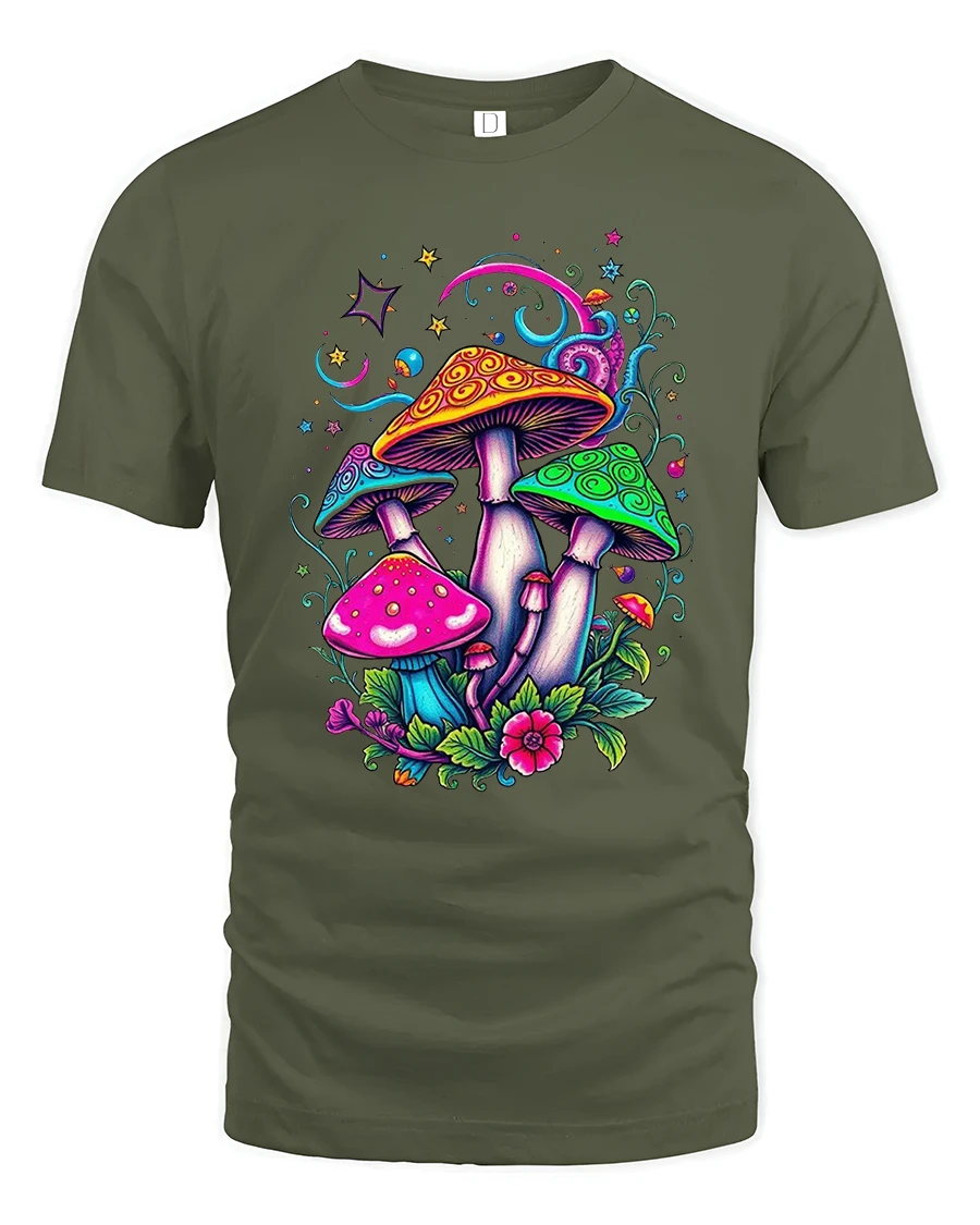 Psychedelic Rainbow Mushroom Tee with Colorful Fantasy Art delivers a bold and imaginative statement piece filled with vibrant colors and whimsical details. The bright neon mushrooms rise from a lush fantasy garden while swirling stars and magical shapes float around them, creating a dreamlike artwork that stands out instantly. Each mushroom cap is adorned with glowing patterns and radiant hues, capturing a mesmerizing psychedelic aesthetic.