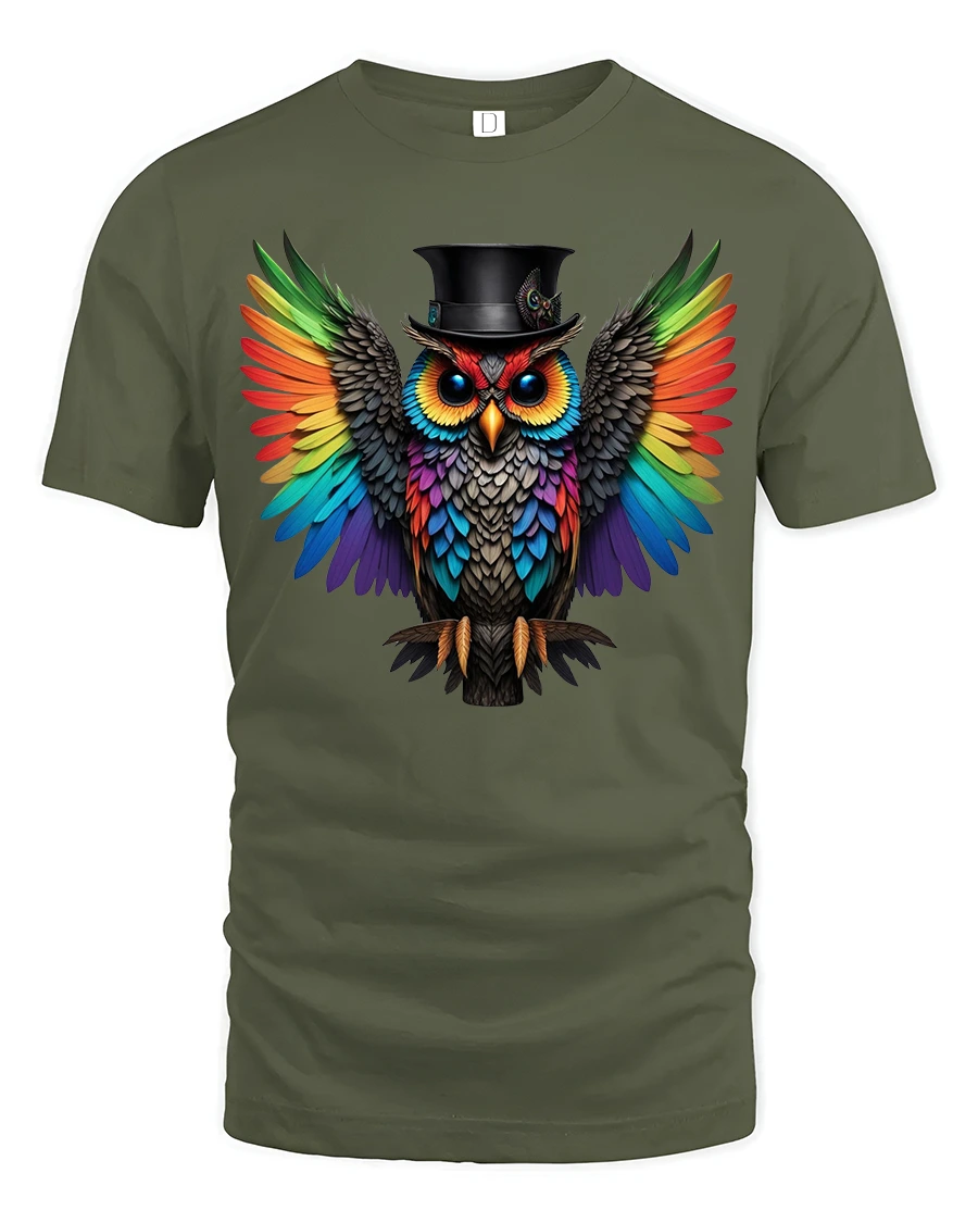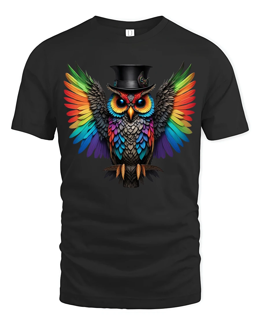 Rainbow Owl Tee With Bold Colorful Wings And Cool Style captures a balance of wisdom and creativity through its detailed feather work and vibrant palette.