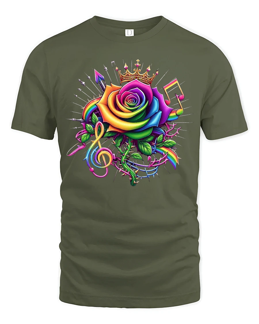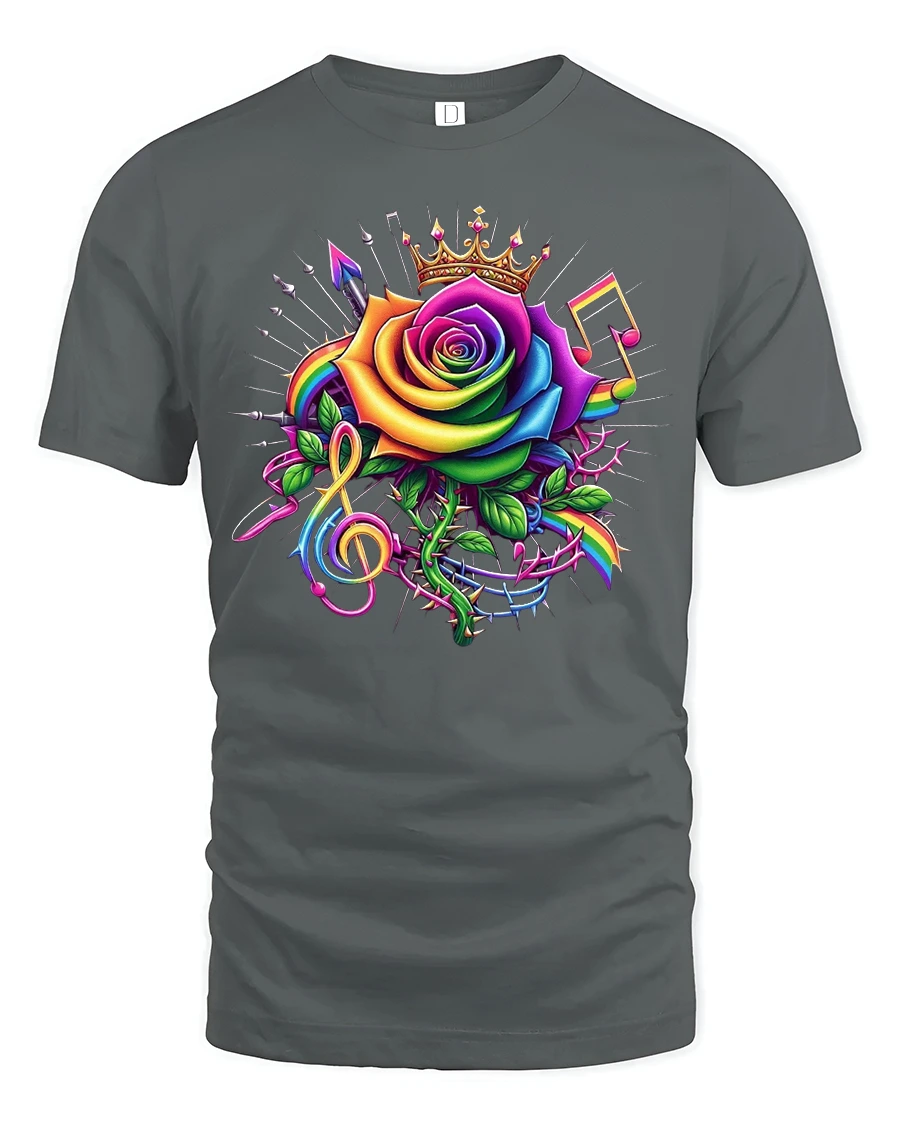 This Rainbow Rose Music Crown Tee Vibrant Artistic Musical T-Shirt blends color, creativity and musical expression into one bold design. Featuring a stunning rainbow rose surrounded by treble clefs, music notes, thorns, and a golden crown, this graphic symbolizes passion, artistry, and the power of music. The vivid neon tones and detailed illustration give the artwork a dynamic, eye-catching look that stands out in any crowd.